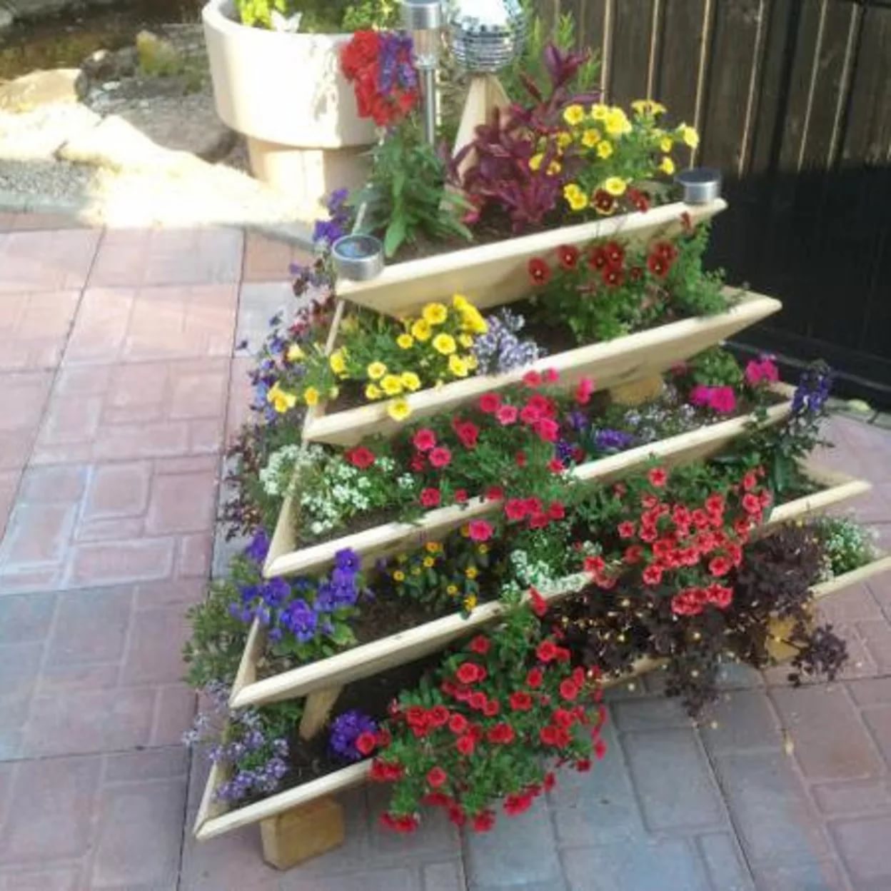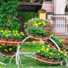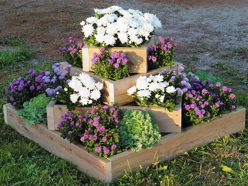 Anstelle von Brettern kannst du die alte unnötige Kommode nehmen. Seine Schubladen sind wie Treppen herausgezogen und mit dichtem Wachstuch ausgekleidet, auf das Erde gegossen wird, Blumen werden gepflanzt. Aber die Pflanzen sollten eine mäßige Bewässerung benötigen, da übermäßige Feuchtigkeit den Baum schnell zerstören wird. Und im besten Fall kann man nicht mit mehr als 10-15 Dienstjahren einer solchen improvisierten Art von Blumenbeeten rechnen.