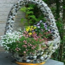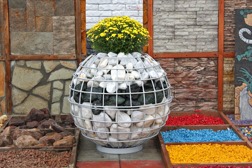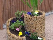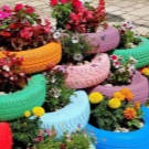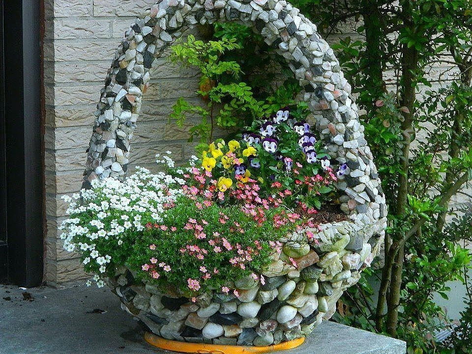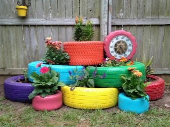 Eine gute Möglichkeit, einen mehrstöckigen Ständer zu erstellen, ist die Verwendung alter Reifen. Sie sind in leuchtenden expressiven Farben gemalt, sie sind auch übereinander gestapelt und mit Erde gefüllt. Designer halten jedoch die Verwendung von Steinen für eine ästhetische Option. Selbst ein zerbrochener Stein ist dem Gummi in seiner Qualität weit überlegen, er ist schöner als er und hält viel länger.