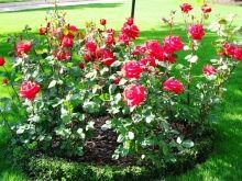 Eine weitere Möglichkeit besteht darin, die Kanten des Rasens mit Rosen zu arrangieren. In diesem Fall können Sie eine beliebige Pflanzenhöhe pflanzen. Bei der Wahl eines strukturierten Rosenkranzes entsteht tatsächlich ein Miniaturgarten - Sie können der Komposition Sitzgelegenheiten und eine Terrasse, Wände, Brunnen, sogar kleine Teiche hinzufügen. Alle Rosen werden in solchen Fällen als Bandwürmer gepflanzt. Eine ausgezeichnete Annäherung ist der Südhang, der mit kurzen Blumen, sowie Kämmen oder Rasen bedeckt ist.