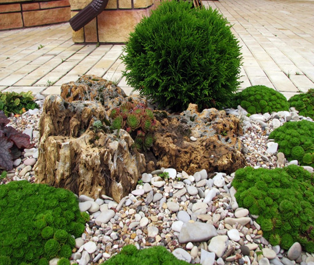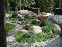 Wenn Sie große Felsbrocken verwenden können, tun Sie es, aber legen Sie sie als Akzentelemente auseinander. Die Bodenoberfläche ist mit Kies oder Kieselsteinen verziert.