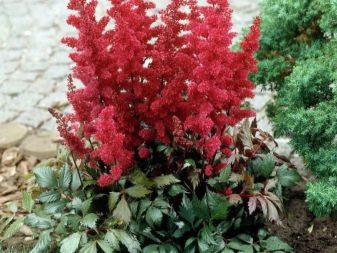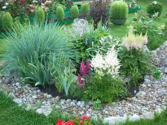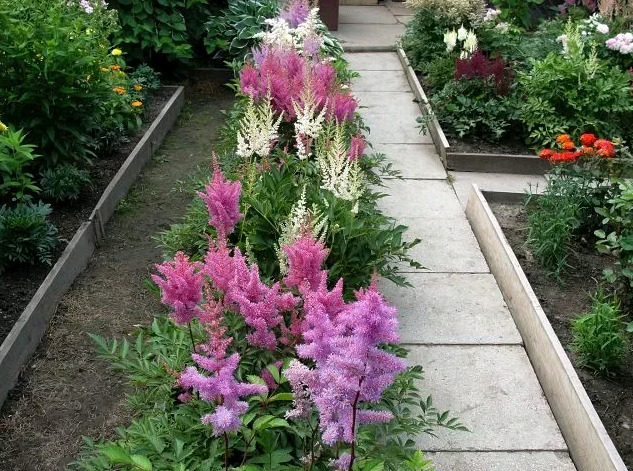 Astilba ist ein häufiger Gast in Blumenbeeten, es sieht sehr gut aus, auch wenn es einen dicken Schatten auf dem Boden gibt. Der Sortenunterschied ermöglicht es, Dickichte in ganz unterschiedlichen Größen zu schaffen. Ungleich zu einander und färbenden risparen Blumen. Landung Astilbe und Hosts sind perfekt kombiniert. Gelenium verträgt Schatten nicht so gut, aber es blüht kraftvoll und fast die gesamte Warmzeit.