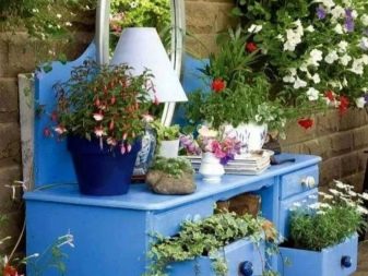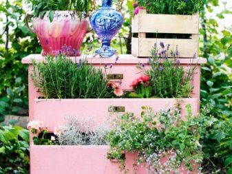 Wenn alte Möbelstücke weggeworfen werden, kann man sie nicht nur ganz, sondern auch sehr interessant einsetzen - indem man die Schubladen entfernt und sie zu einem "Blumenstrauss" macht. Da solche Strukturen eingeweicht werden können, ist es besser, sie unter Schuppen, auf Veranden, in Pavillons zu stellen. Neben dem Selbstgebrauch bilden sie manchmal ein "Bank" -Blumenbett, aber hier sind größere Kästen erforderlich.