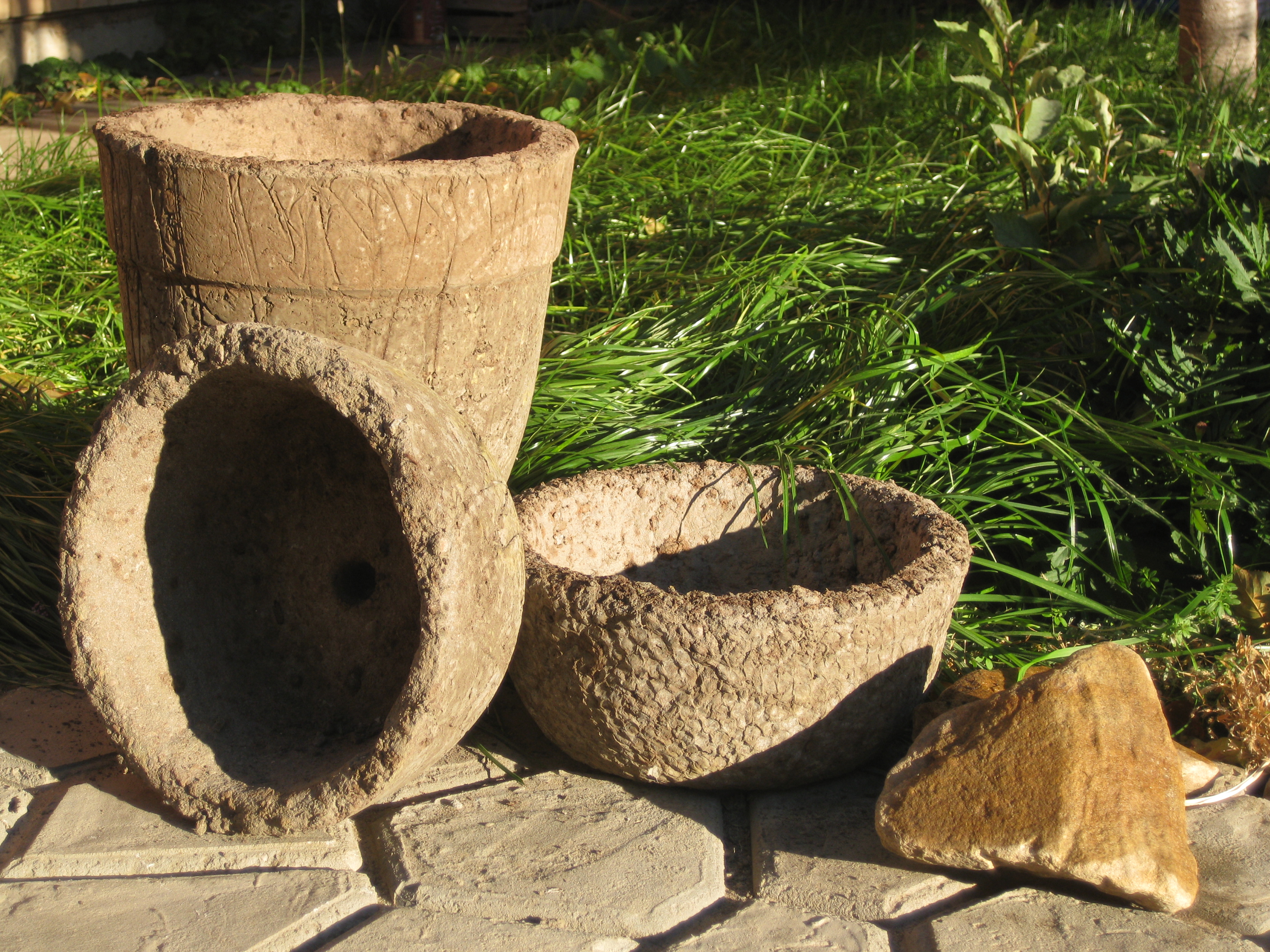Ein anderes gutes Abfallmaterial ist überschüssiger Zement, der nach dem Bau oder der Reparatur übrig bleibt. Die Lösung wird über ein Gitter gegossen, das auf dem Boden eines geeigneten Behälters angeordnet ist. Ein gewöhnlicher Lebensmittelfilm bedeckt die andere Oberfläche, seine Hauptvorteile sind Weichheit und fester Sitz der Oberfläche.Ein Armierungsgewebe wird auf die Mörtelschicht gelegt und danach wird noch einmal Zement aufgetragen. Zur Dekoration können Kieselsteine, Schotter, gerissene Keramikfliesen verwendet werden; nachdem der Mörtel ausgehärtet ist, muss die Form entfernt werden, und der Empfang des Topfes der erforderlichen Größe und Konfiguration ist abgeschlossen.