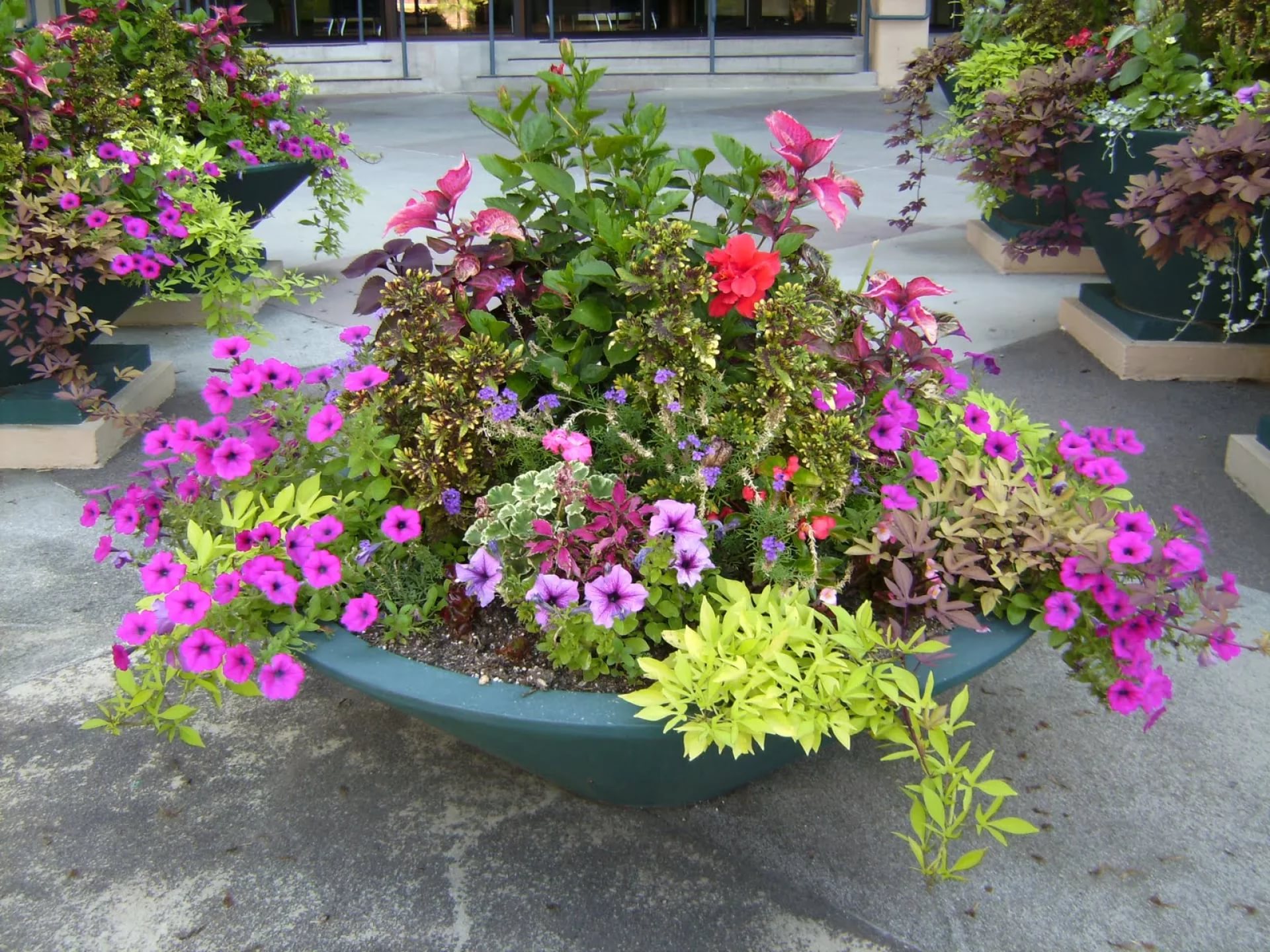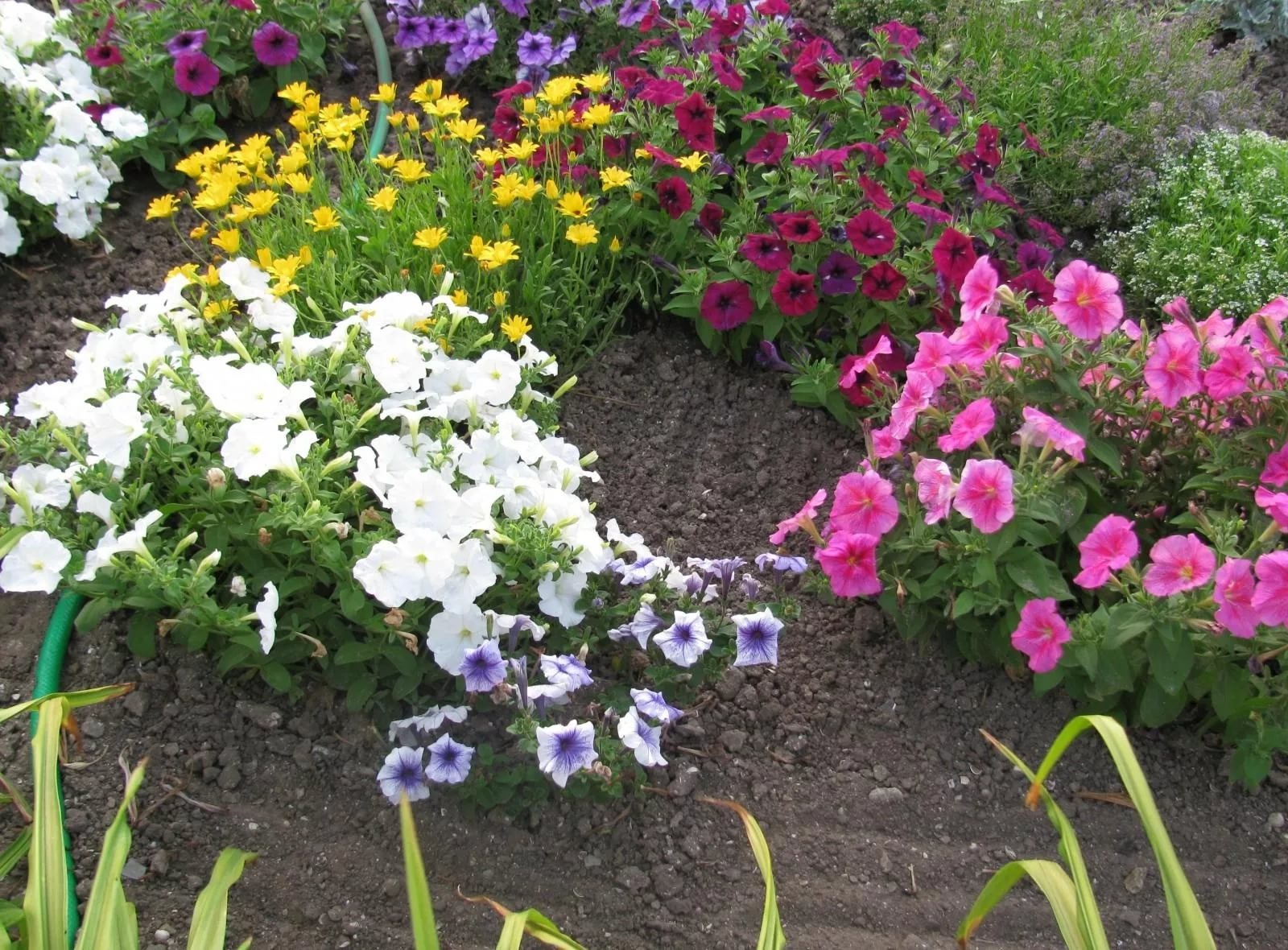 Aber mit all den Tugenden der Petunie, um von ihr eine kontinuierliche Blüte zu erreichen, funktioniert nicht. Daher ist es notwendig, eine zusammengesetzte Zusammensetzung verschiedener Arten zu bilden. Das Blumenbeet, das von Frühling bis Herbst blüht, sollte voluminös sein und eine große Fläche einnehmen. Dies ist nicht nur auf eine erhebliche Anzahl notwendiger Pflanzen zurückzuführen, sondern auch auf die Notwendigkeit, ein ausdrucksstarkes Ensemble zu schaffen. Diverse, hier und dort gepflanzte Kulturen schädigen und verschlechtern die ästhetischen Qualitäten von Plantagen.