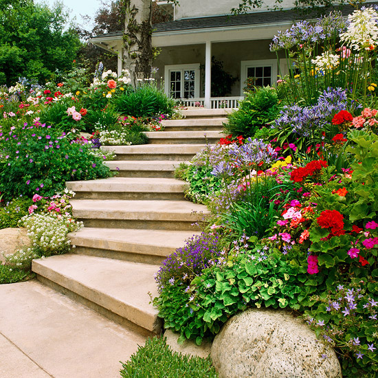 Es ist nicht notwendig, ein Blumenbeet oder einen Blumengarten in der Nähe des Hauses zu haben. Eine schöne Alternative ist die Platzierung im Erdgeschoss (das vordere Gartengrundstück) und direkt am Eingang des Territoriums. Nicht schlechter als die Anordnung der Betten in den Erholungsgebieten, unter den Rasenflächen (es verdünnt die Monotonie des grünen Grases), in der Nähe der Terrassen. Attraktive Pläne, die Blumenpflanzungen in der Nähe der Zäune entlang des äußeren Umfangs des Geländes, auf der Oberseite der Stützmauer oder entlang der Ufer eines künstlichen Reservoirs vorsehen.