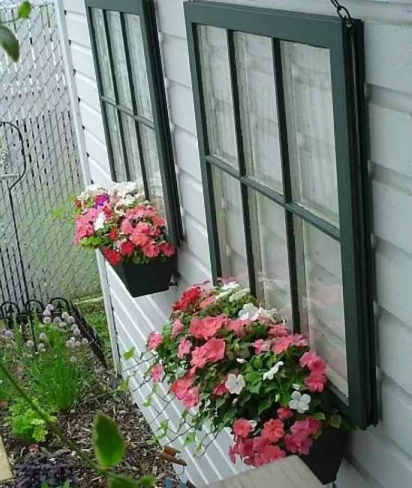 Wenn wir über die Verwendung von Abfall sprechen, ist dies ein logisches Maß für Anfänger und nicht für erfahrene Designer. Sie riskieren nichts und können gleichzeitig im Erfolgsfall viel Geld sparen. Es gibt eine Reihe von Möglichkeiten, genau dies zu tun. Also, mit Hilfe der alten Fenster, auf denen wir eine Kiste mit Blumen befestigt haben, bekommen wir ein ziemlich elegantes dekoratives Element.
