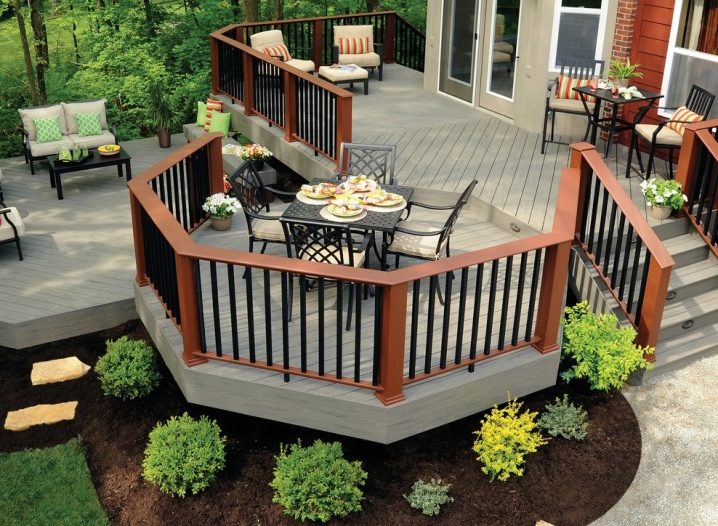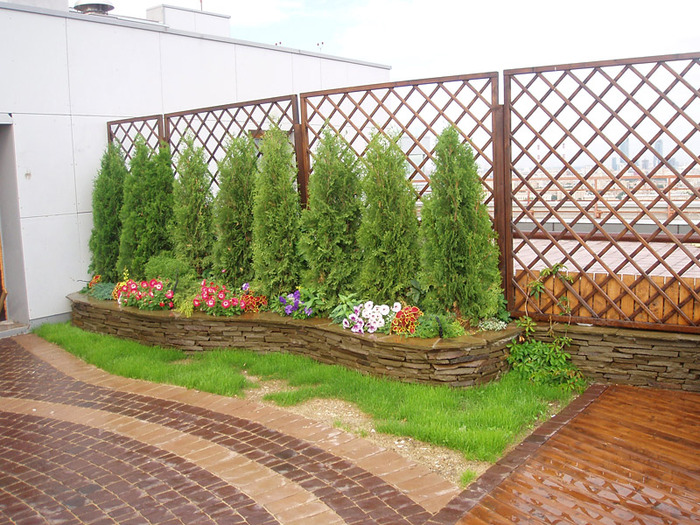 Neben der Terrasse ist es unerwünscht, zu üppig ein Blumenbeet zu brechen, es wird die ganze Aufmerksamkeit auf sich ziehen. Die Ketten von niedrigen Sträuchern, die sich entlang des Umfangs des wichtigsten Teils der Terrasse befinden, reichen ebenfalls aus.