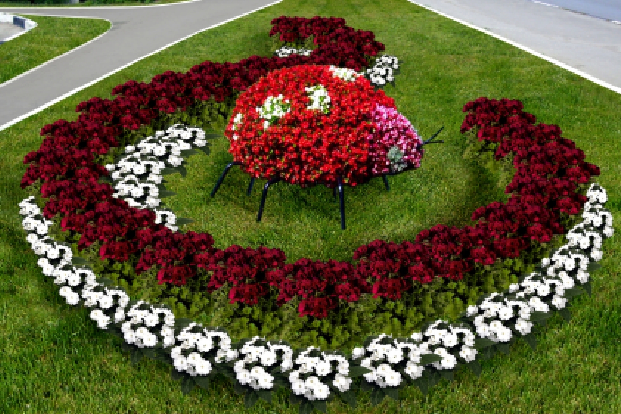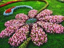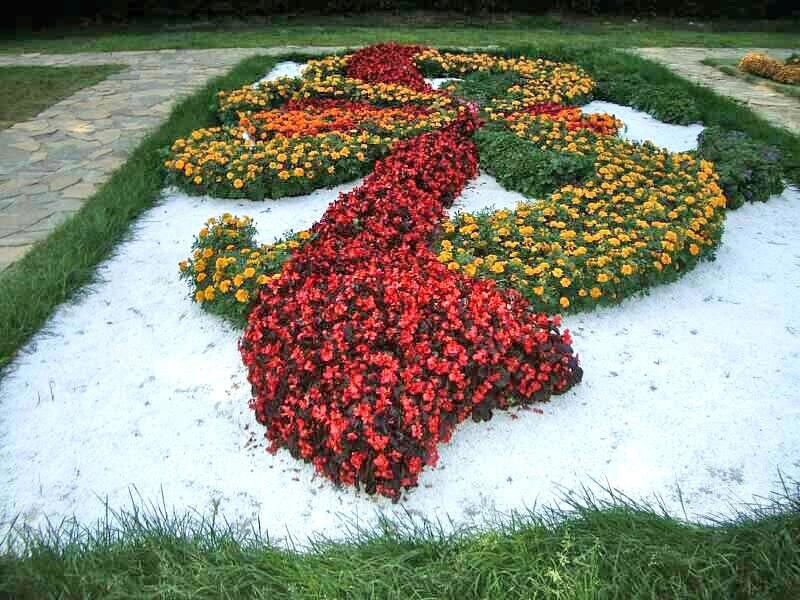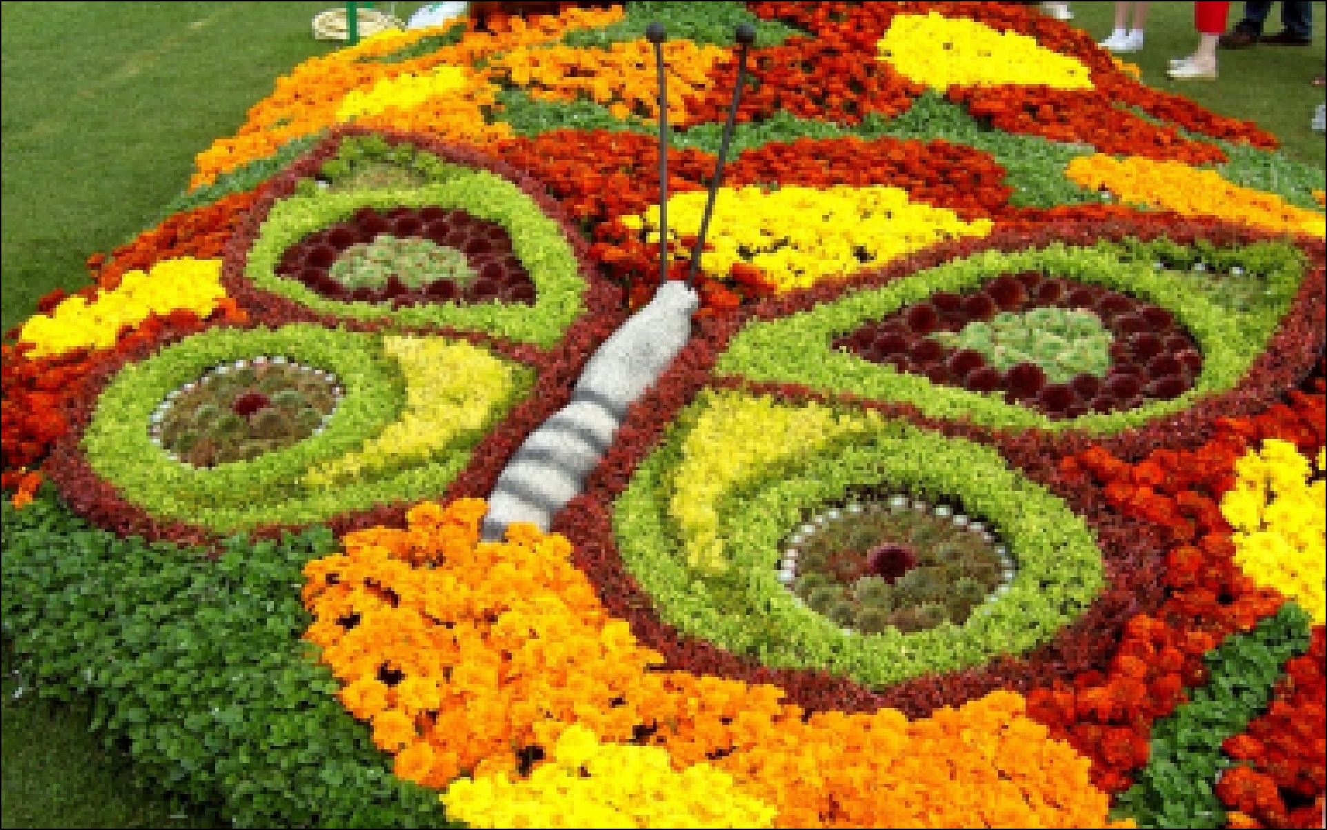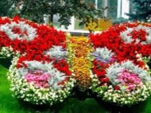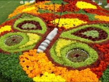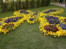 Zum Beispiel hat ein Blumengarten in der Form eines Schmetterlings eine rechteckige Form, und in den Ecken ist grünes Gras gepflanzt. Der zentrale Teil ist von Torso, Kopf und Flügel eines Schmetterlings besetzt. Die Grenzen der Flügel sind mit Pflanzen der gleichen Sorte bepflanzt, der Rest des Raumes ist mit bunten Blumen und Miniatur-Büschen gefüllt.