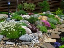 - Steingarten - Dies ist ein Blumengarten mit künstlichem bergigem Gelände und Steinen. Im Steingarten gepflanzte kriechende Stauden und Knollenvarietäten.Eine solche Zusammensetzung kann sogar auf einer kleinen Fläche angeordnet werden.