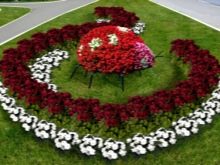 Hohe Pflanzen werden nicht empfohlen, da die Zeichnung nur aus der Höhe betrachtet werden kann. Es ist einfach, das Lied "Herz" zu machen. Die Konturen des Bildes aus Pionen, die wegen ihrer Pracht und Helligkeit beliebt sind. Im Inneren kann der Raum mit luxuriösen Rosen gefüllt werden.