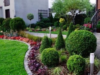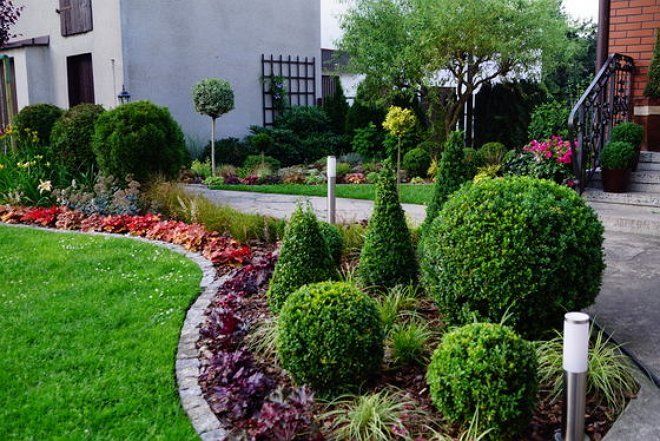 Moderne Blumenbeete sind oft mit Nadelbäumen geschmückt, die zu jeder Jahreszeit schön aussehen.