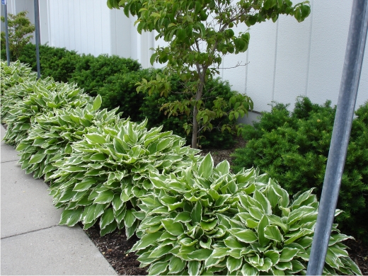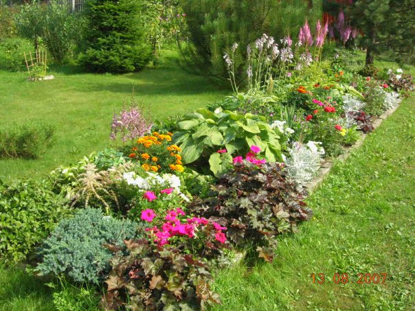 - pflanze hohe Pflanzen entlang des Bordsteines oder Zauns und kurze Pflanzen nach ihnen. Ein Streifen langer Blumen wird die Grenze effektvoll schmücken, und der nächste Streifen niedriger Pflanzen vervollständigt die Komposition. Es ist angebracht, die Gastgeber zu benutzen, die für ihre prächtigen Blätter der ursprünglichen Form berühmt sind;