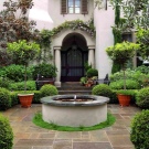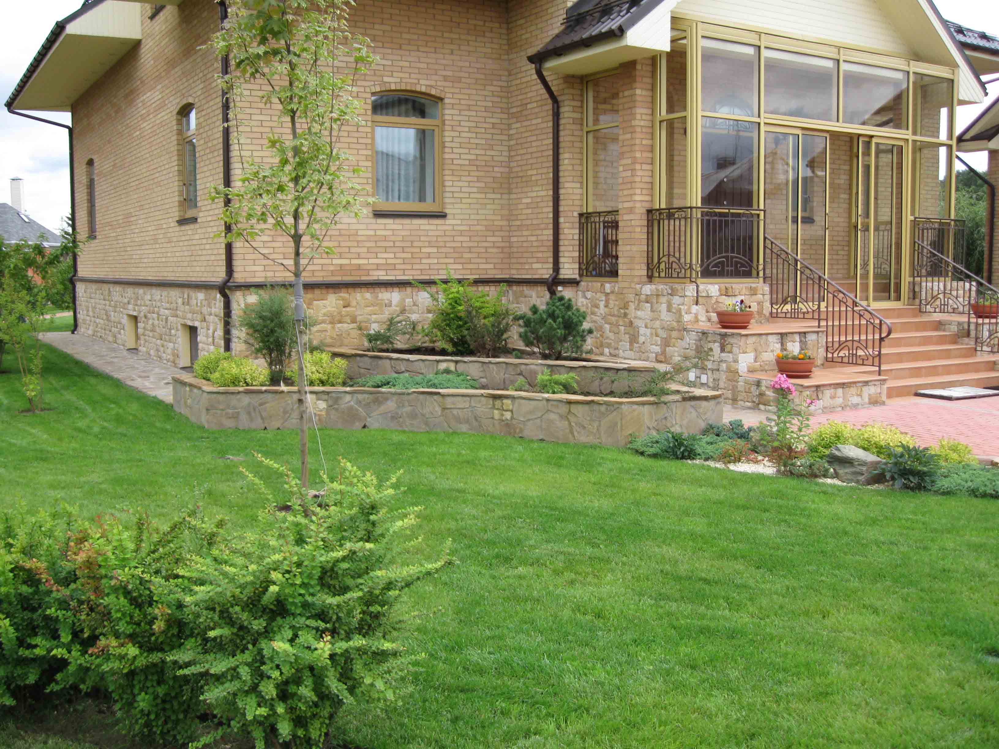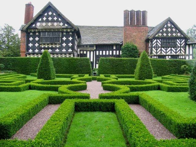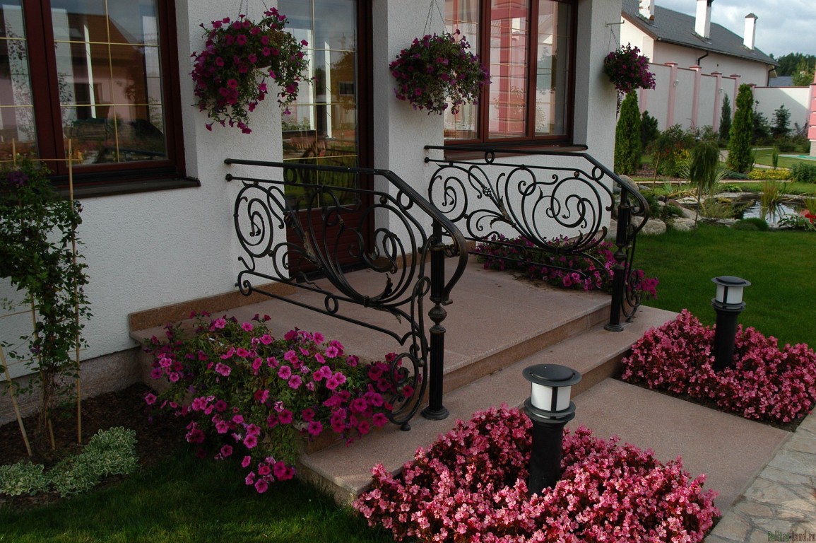 Das Parterre oder sonst zeremonielle Raum vor dem Haus, ist es möglich, mit einem Blumenbeet, andere dekorative Pflanzungen zu dekorieren.Meistens werden kleine Pflanzengruppen oder Bandwürmer gepflanzt, um die Schönheit des Gebäudes nicht zu verdecken, sondern nur um seine Eleganz zu betonen. Teppichparkett gilt als vollständig eingeebneter Bereich; In einigen Fällen werden Nadelbaumplantagen verwendet, um ein dekoratives Element unabhängig von der Jahreszeit zu schaffen.