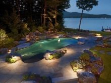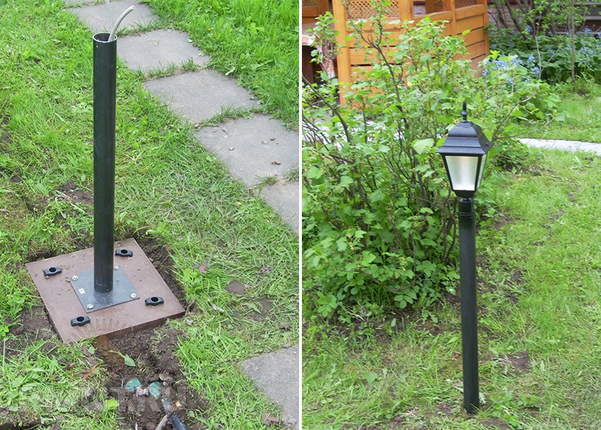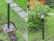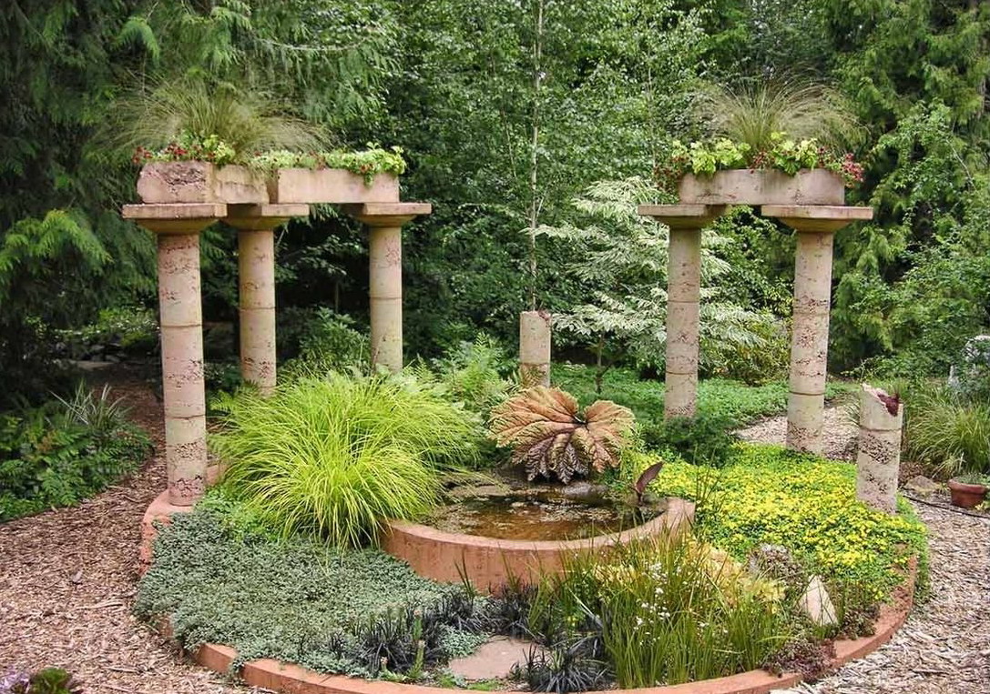 Die Laternen, die in der Nähe des Teiches platziert sind, helfen, den Ausblick auch am Abend und in der Nacht zu genießen, um einen romantischen Spaziergang zu machen.Und dekorative Säulen auf Leichtbetonbasis helfen, die visuell unterschiedlichen Teile des Territoriums voneinander zu trennen. Die Geometrie der Säulen ist sehr unterschiedlich und sie können zu eleganten komplexen Kompositionen zusammengesetzt werden.