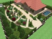 Ein Garten, der diagonal (genauer gesagt, entlang mehrerer paralleler Diagonalen) dekoriert ist, zeigt sich sehr gut, wenn das Territorium klein ist und man es so weit wie möglich schieben muss, um das Gefühl von gequetschtem Raum zu überwinden. In vielen Fällen sind Artenpunkte sehr ungünstig gelegen - und dann muss man auf ein freies Layout zurückgreifen.Sein Vorteil gegenüber allen früheren Versionen ist die maximale Nutzung von natürlichen Reliefs.