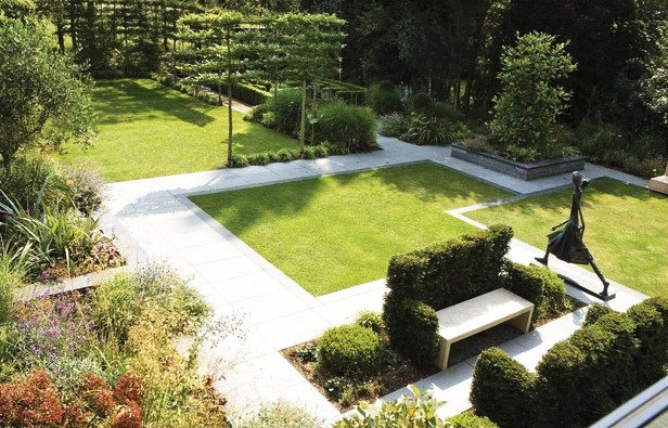 Ein moderner Garten ist, wenn nichts überflüssig ist. Hier sind nur der ursprüngliche Rasen in der Form des Buchstaben G, niedrige Büsche mit weißen Blumen und ein Baum im Hintergrund; Dies sind alles Gemüsedekorationen auf dem Weg zum Haus. Ein ungewöhnlicher Ansatz kann auf jeden Fall genommen werden - sogar in einem normalen Garten.Was ist mindestens eine Skulptur wert, die oben auf einem dichten Busch installiert wird, oder eher, es überragend.