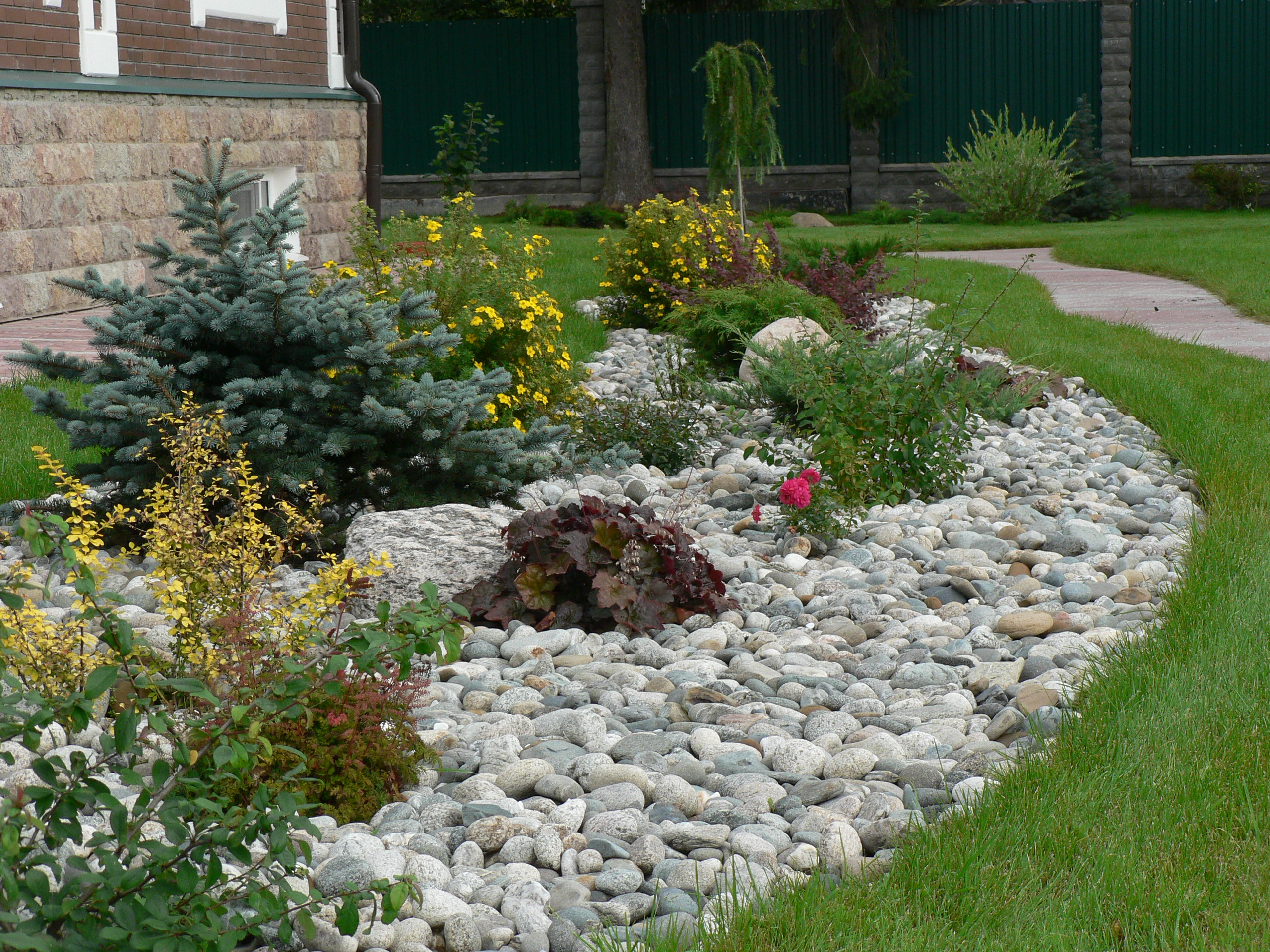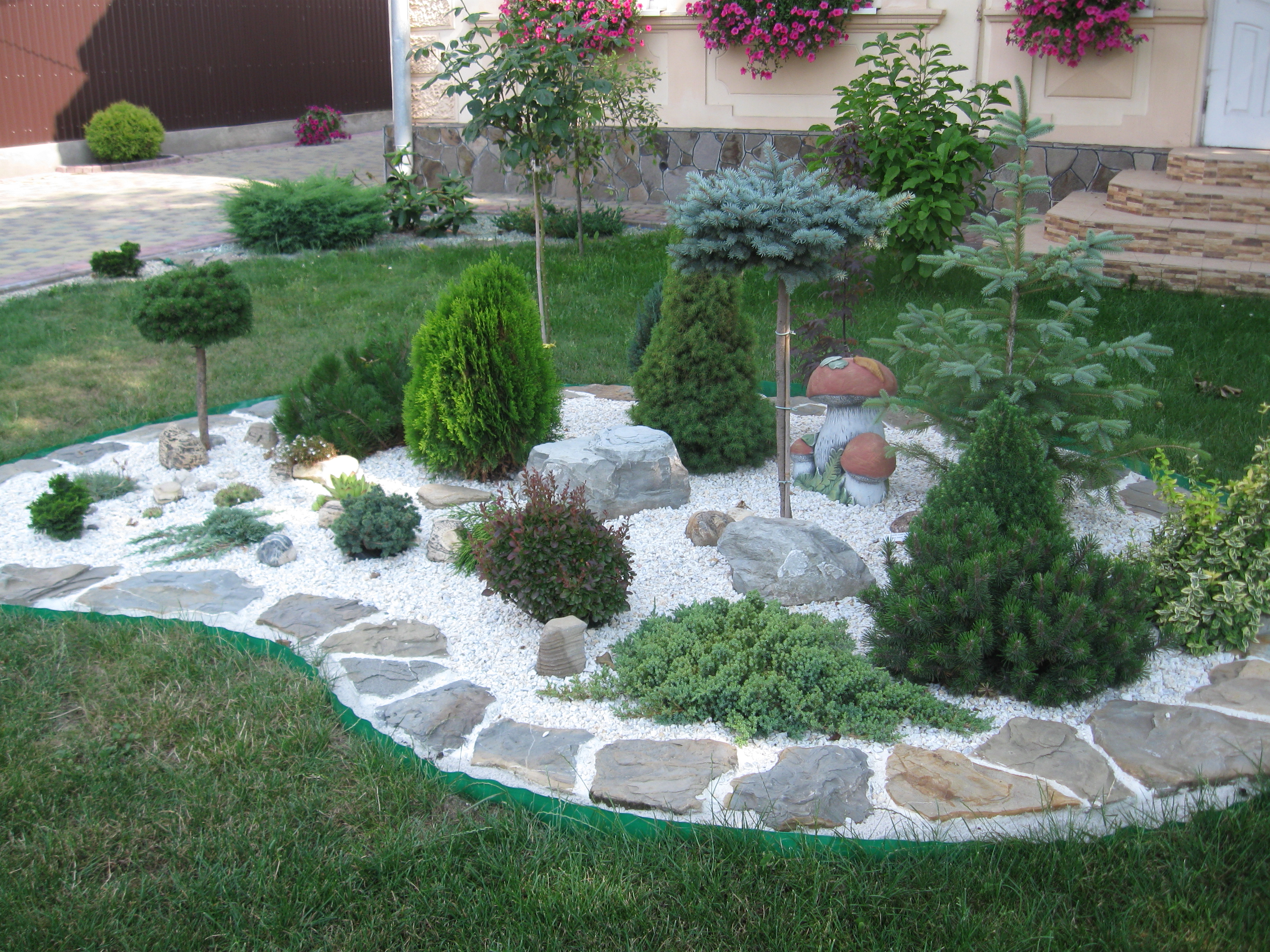 Neben den beiden aufgeführten Elementen spielen Blumenbeete eine wichtige Rolle bei der Gestaltung des Raumes. Durch die Kombination der Drehungen der Tracks mit Blumenarrangements können Sie einen sehr originellen Design-Effekt erzielen. In den Hauptgassen, wenn nur genügend Platz vorhanden ist, um sie klar zu unterscheiden, wird eine gepunktete Einbaubeleuchtung verwendet, wodurch die externen Vorteile betont werden. Das Lagerfeuer kann geschlagen werden, Es ist jedoch ratsam, sich an professionelle Designer zu wenden, um schwerwiegende Fehler zu vermeiden. Symbolisch gesehen, dient ein gepflasterter Rundbau als Symbol für ein Freudenfeuer, in dessen Mitte sich eine kleine Fossa (Rille) befindet, die ebenfalls sorgfältig beschnitten wurde.