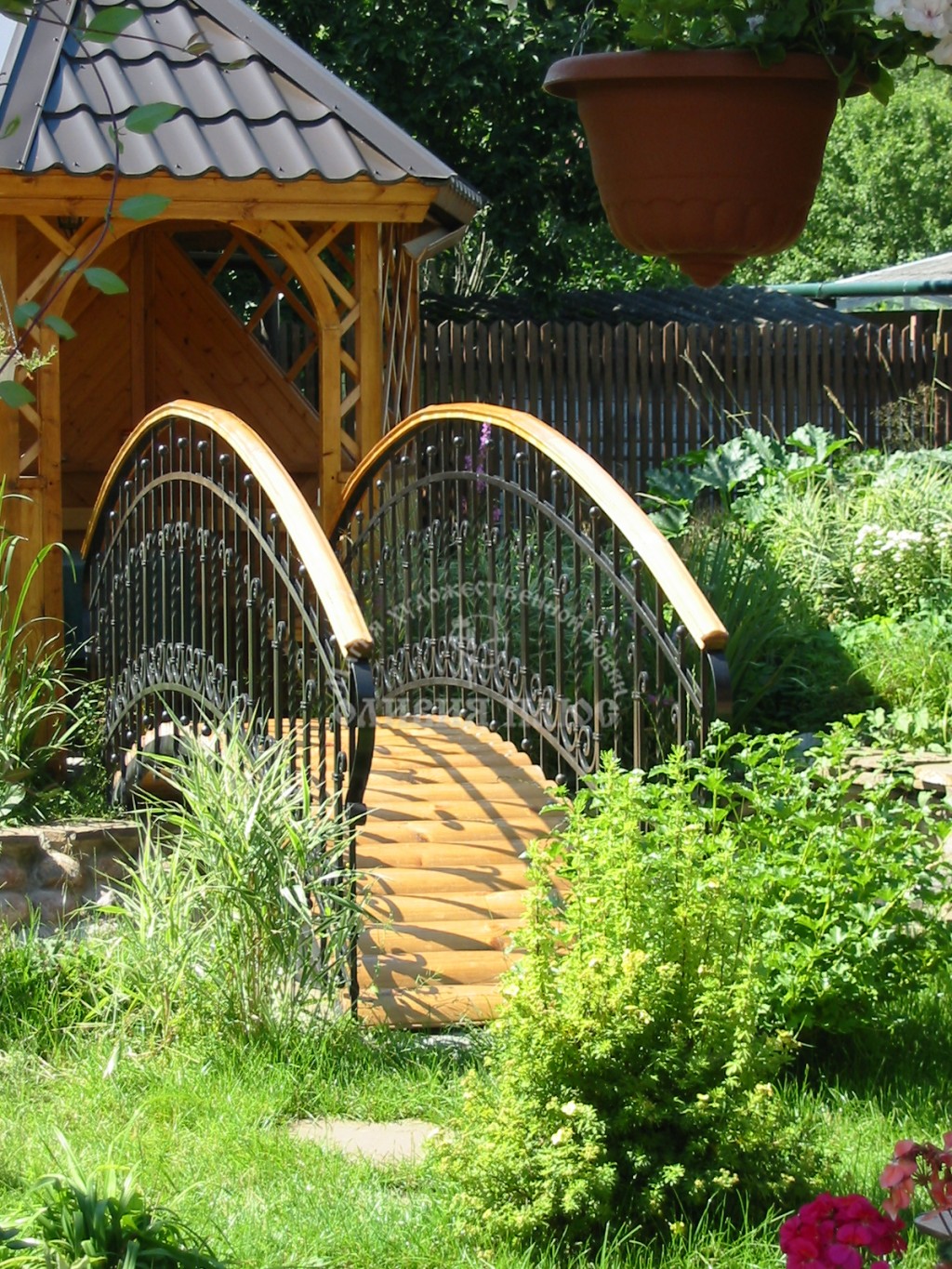 MAFY, einschließlich Brücken, können Kräuterzusammensetzungen elegant ergänzen, wenn sie vollständig mit ihrem Geist übereinstimmen. Aber Sie sollten nicht zu viele kleine architektonische Formen verwenden, lassen Sie sie weniger sein, aber die Betonung wird ausdrucksvoller sein. Der Kamin neben den Grünflächen dient gleichzeitig als Dekorationselement und als bequeme Plattform für das Recycling von gebrochenen Ästen, trockenem Gras und Laub.