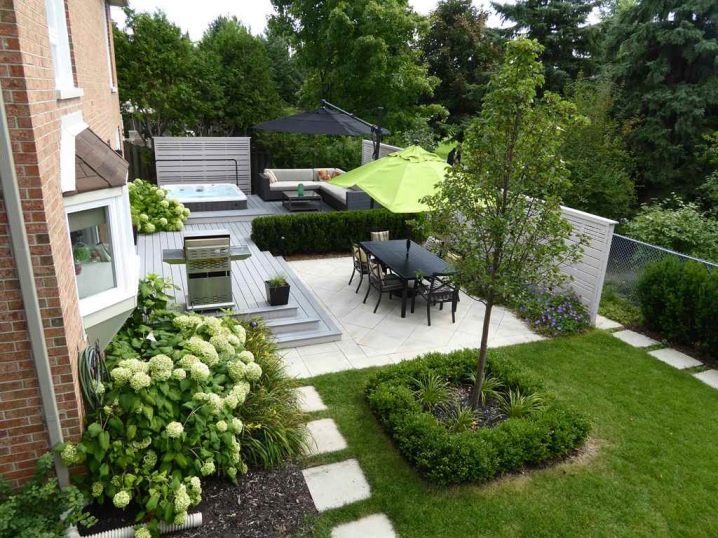 Betrachtet man dieses Foto, ist es leicht zu finden, dass die Designer von einem völlig anderen Konzept kamen. In der Nähe des Ziegelhauses neben dicht gepflanzten Gruppe von weißen Kniebeugen Blumen. Die Veranda und der angrenzende Treppenabsatz sind mit weißem Stein bedeckt. Die schwarzen Möbel der Essgruppe auf der Straße werden durch eine leichtere Basis als in anderen Orten vorteilhaft abgesetzt. Von der Erholungszone ist dieser Ort durch eine Hecke von geschnittenen Sträuchern mittlerer Höhe getrennt. Im Vordergrund ist ein einsamer Baum, umringt von einem quadratischen Blumenbeet.