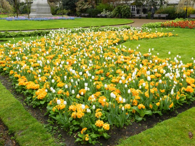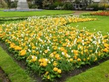 Diese Farbe passt perfekt in das Design des Gartengrundstücks. Er kann leicht schöne lebendige Kompositionen auf Ihrem Sommerhaus erstellen. Gelbe Farbe kann den Besitzern des Landes eine echte Frühlingsstimmung geben. Viele Menschen benutzen oft ganze Blumenbeete mit gelben Blumen (Narzissen, Zwergiris, Tulpen) für die Dekoration ihres Gartens. Manchmal können Sie in solchen Betten gelbe Blumen mit Pflanzen anderer Farbtöne abwechseln, um eine übermäßige Helligkeit im Design zu vermeiden.