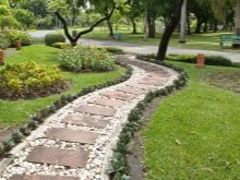 Ein weiterer wichtiger Schritt in der Gestaltung des Vorstadtbereichs ist die Gestaltung der Gleise. Es ist notwendig, den Hauptweg, der zum Haus führt, und ein paar zusätzliche kleine Wege, die alle Bereiche des Geländes verbinden könnten, zu schaffen. Meistens, um Wege zu schaffen, benutzen Sie Materialien wie Kiesel, Fliesen, Sand.