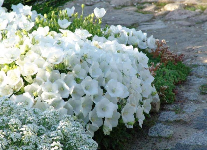 Praktisch in jedem Design des Ferienhauses werden Kombinationen von Farben aus verschiedenen Schattierungen von Weiß gut aussehen. Damit die Blumensträuße aus weißen Blumen nicht zu einfach und uninteressant aussehen, sollten sie mit anderen Blumen oder Knospen abgewechselt werden. Die beliebtesten weißen Pflanzen für die Gartendekoration sind Maiglöckchen, duftender Tabak und Salbei.