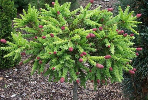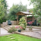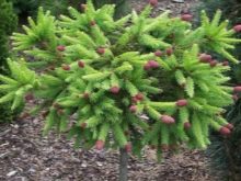 Wenn Sie wirklich einen großen Baum wollen, dann überlegen Sie sich einen Platz besonders sorgfältig. Stellen Sie sich vor, dass es in 20 Jahren wachsen wird und andere Pflanzungen stören kann, da es die Sonne schließen wird. Eine interessante Idee könnte die Gestaltung eines Naherholungsgebietes um einen großen Baum sein: Der Stamm kann als Stütze für einen Pavillon, einen Baldachin oder eine Hängematte dienen, und das Laub in der heißen Sommerhitze schützt vor der sengenden Sonne. Eine gute Option für einen kleinen Bereich werden Nadelpflanzen sein,Das wird das ganze Jahr über Grüns geben. Eine Vielzahl von Zwergarten von Fichten und Kiefern können Sie jede Zusammensetzung erstellen.