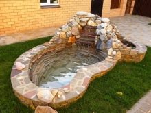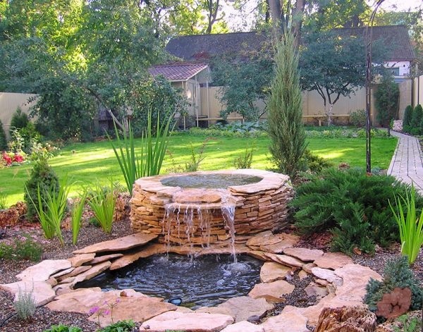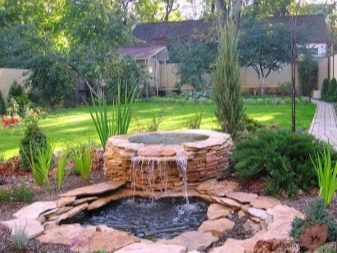 Ein kleiner Teich in der Nähe eines Pavillon oder ein Springbrunnen in der Mitte einer alpinen Rutsche lenkt die Aufmerksamkeit von der kompakten Raum ab.