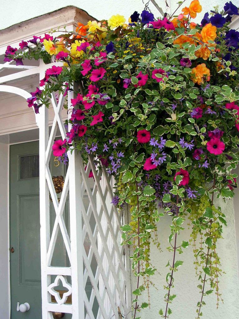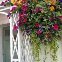 Wenn in horizontaler Richtung nur wenig Platz zur Verfügung steht, verwenden wir Vertikalen: hängenden Töpfe und sogar ganze Blumenbeete auf der Veranda des Hauses und Pavillons, alpine Rutschen, Wände von Gebäuden, ein Zaun.