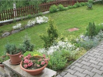 Das Vorhandensein von Blumenbeeten ist als Farbakzent auf dem Rasen zulässig. Sie können Rasen Gras Gebiet des Gartens säen. Zwischen den Bäumen wird ein ordentliches Gras sein, das Platz für den visuellen Luftraum lässt und das Unkraut nicht wachsen lässt.