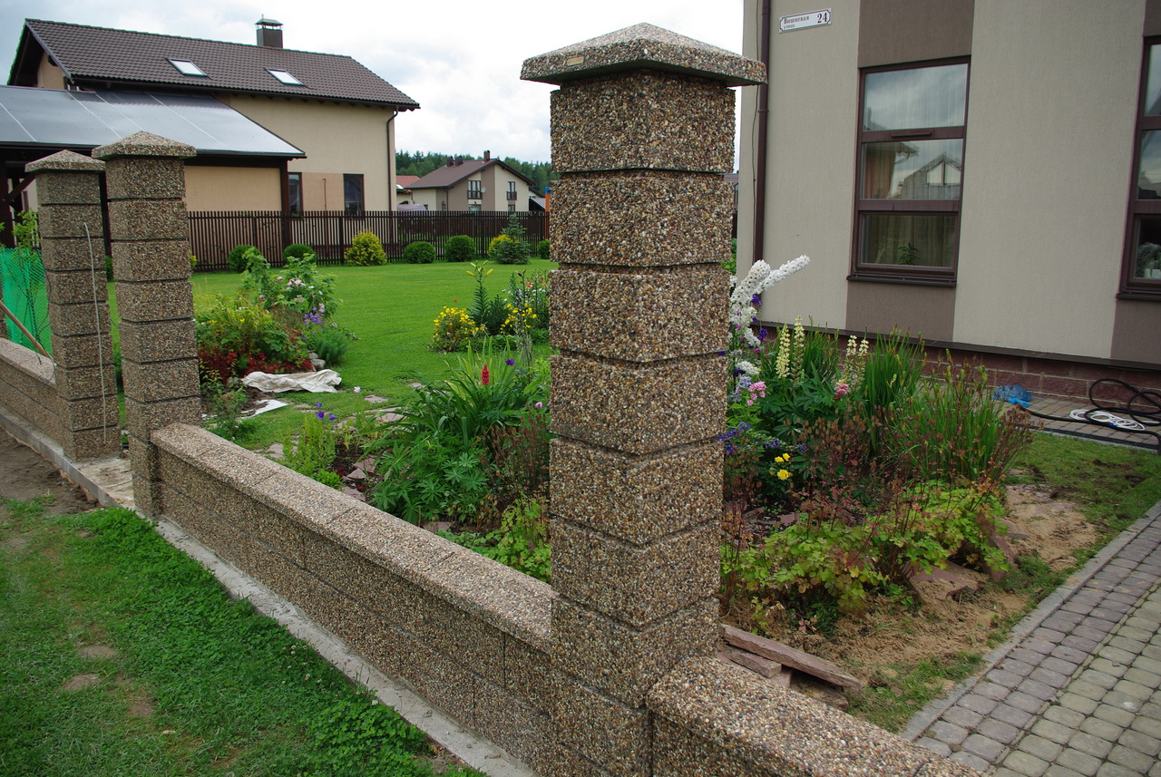 Die übliche Betonpfeiler sieht stumpf und unauffällig aus, daher wird besonderes Augenmerk auf die Dekoration der Stützen für Zäune gelegt. Der Hauptvorteil in diesem Fall ist, dassdass das Finish für die Basis aus Beton absolut beliebig sein kann.