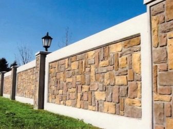 Stützpfosten für Betonzäune sollten ebenfalls im Stil von Spannweiten dekoriert werden. Es gibt vorgefertigte Versionen der Stützen, die komplett mit vorgefertigten Paneelen geliefert werden. Wenn dies nicht der Fall ist, können Sie die Säulen für den Zaun selbstständig dekorieren. Zum Beispiel, für die Paneele in Form von der Wand der Mauer tragen die dekorativen dekorativen äusserlichen Fliesen mit der selben Textur.