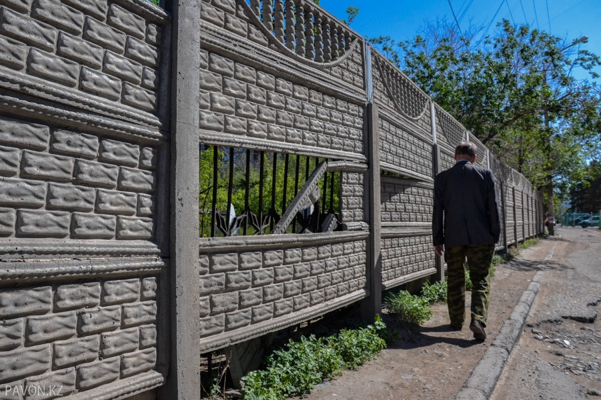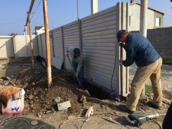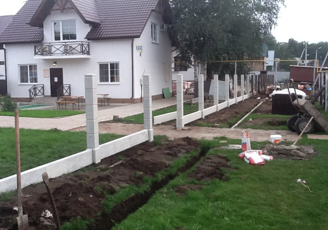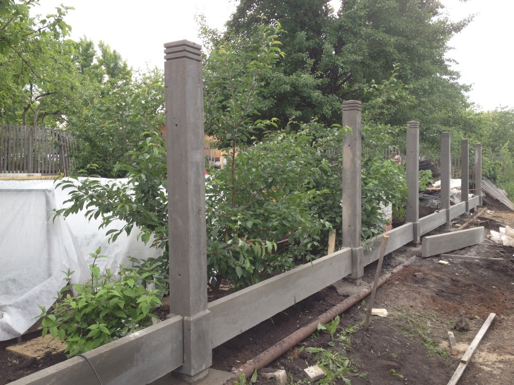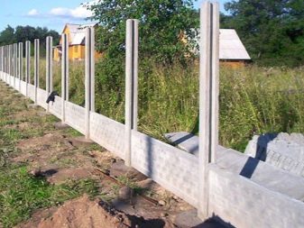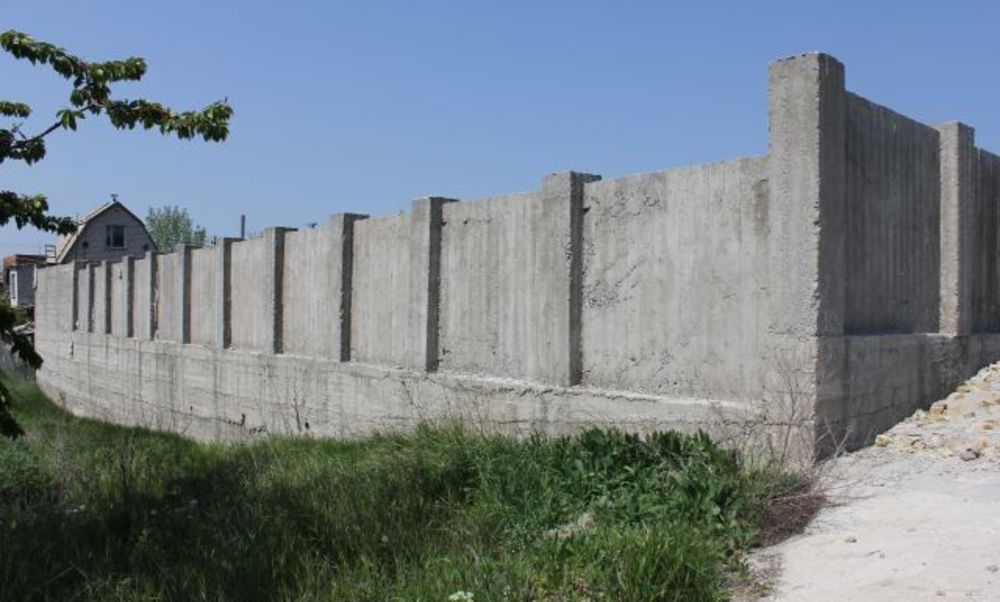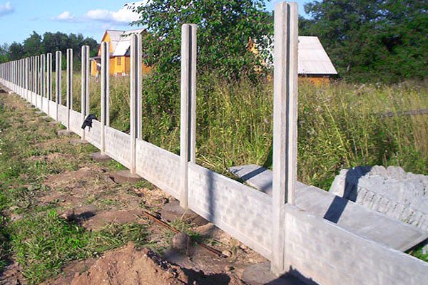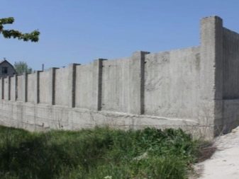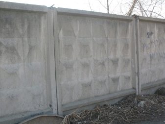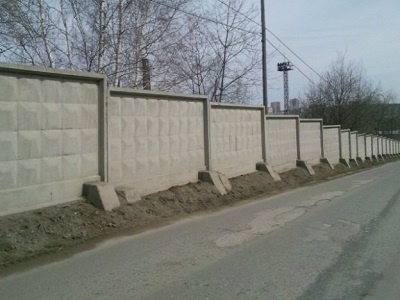Solche Zäune sehen nicht sehr elegant aus - keine Ästhetik und Kreativität, aber die Installation ist ziemlich einfach: es reicht aus, die benötigte Charge Stahlbetonprodukte zu bestellen und mit Hilfe eines Baukrans auf einer ebenen, gefluteten Bandunterlage zu montieren.