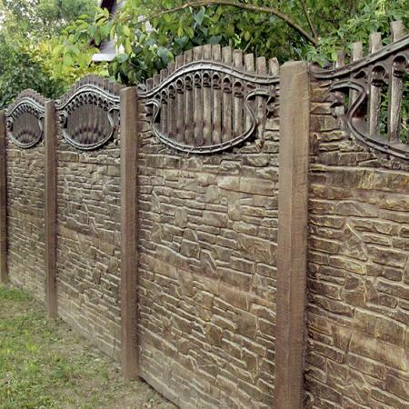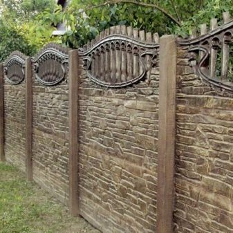 Eine Vielzahl von Betonteilen zum Verkauf ermöglicht es Ihnen, Produkte für den Bau des Zauns auf jedem gewünschten Design zu kaufen. Wenn Sie einen Zaun eines Landhauses im Öko-Stil haben wollen, sollten Sie die Textur der Zaunplatten unter dem Baum kaufen.