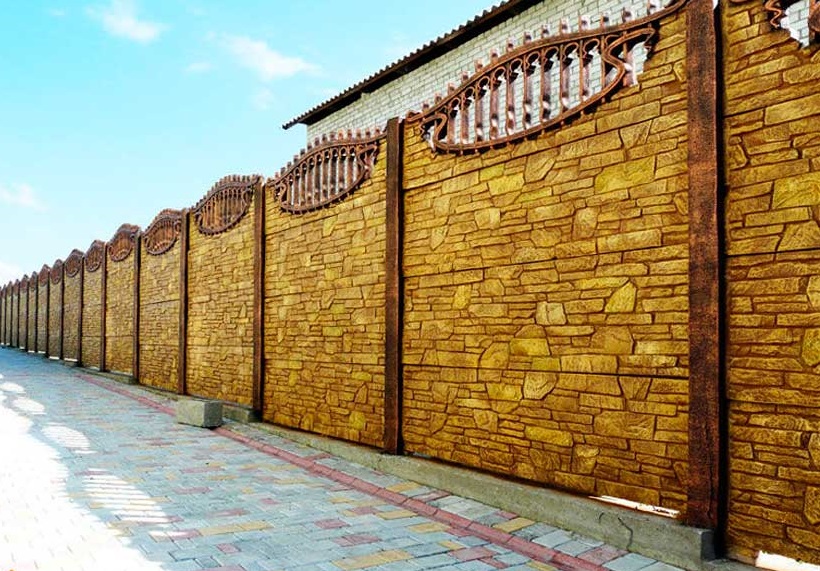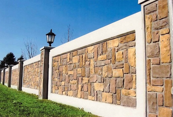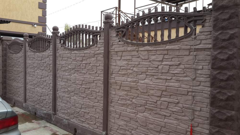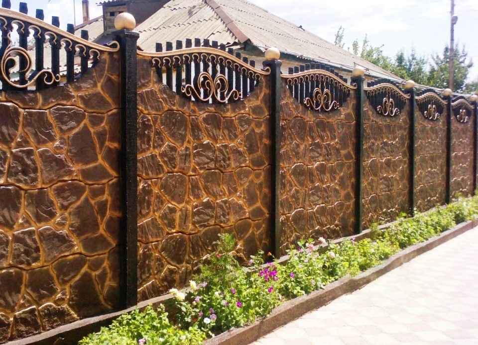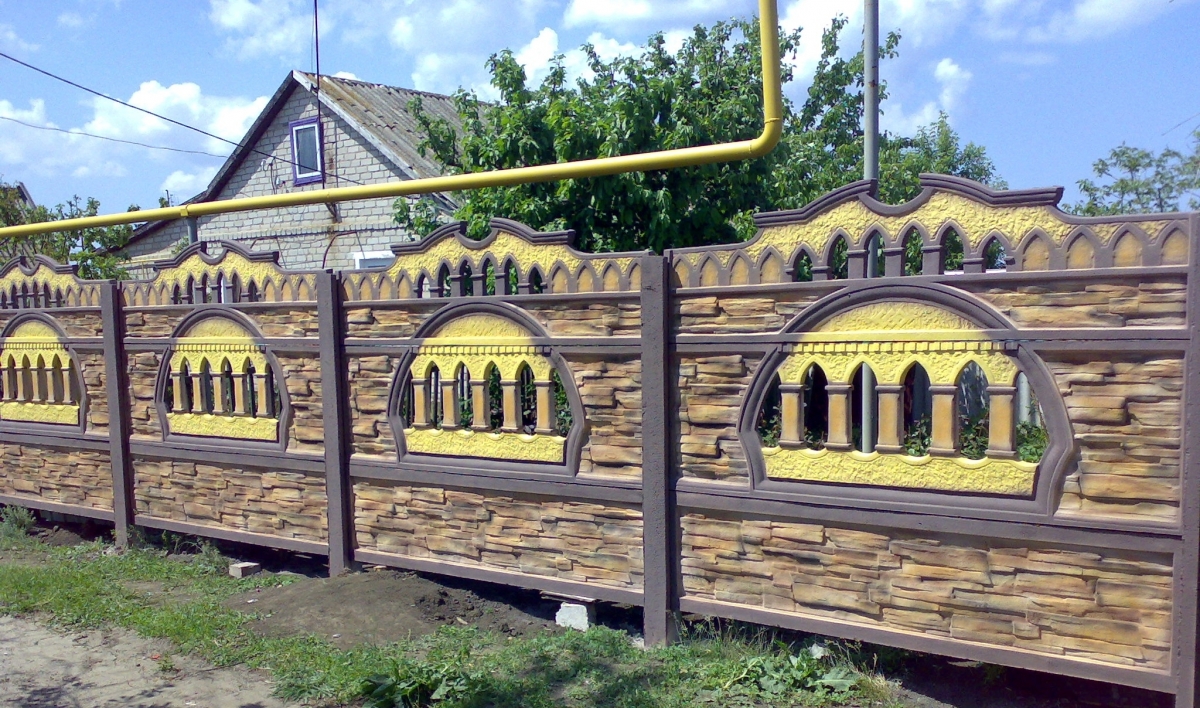 Die Option eines Zauns mit Spannweiten von 4 Abschnitten, imitiert einen Naturstein mit Malerei. Besonders gut schauen durchbrochene obere Elemente.