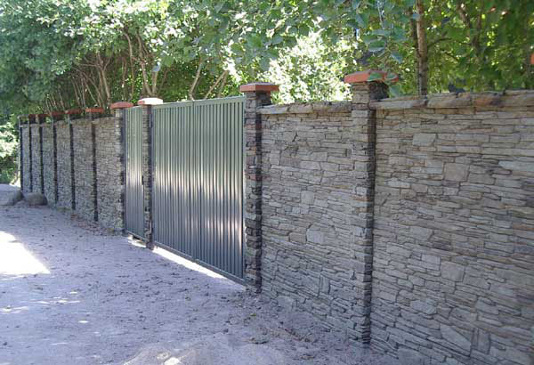 Monolithischer Zaun mit Natursteinverkleidung. Die tragenden Säulen sind ebenfalls im allgemeinen Stil ausgeführt. Solch ein Zaun ist nicht nur sehr schön, sondern auch der haltbarste, er wird Jahrzehnte überdauern.