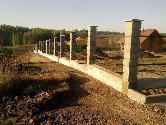 Unter solch einem Zaun braucht man unbedingt eine massive Streifenfundament. Da die fertige Struktur nicht sehr attraktiv aussehen wird, lohnt es sich, ein äußeres dekoratives Finish zu machen.