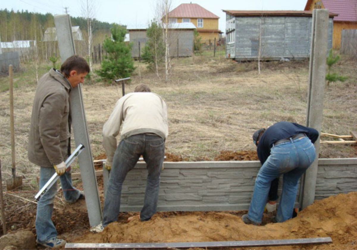 Nachdem die Pfosten installiert wurden, müssen die Zaunabschnitte in jedem Abschnitt in der richtigen Reihenfolge angeordnet werden. Der Hauptteil der Installation des Betonzauns wird damit beendet sein. Nachdem Sie sich um den Bau von zuverlässigen Toren und Pforten kümmern müssen.