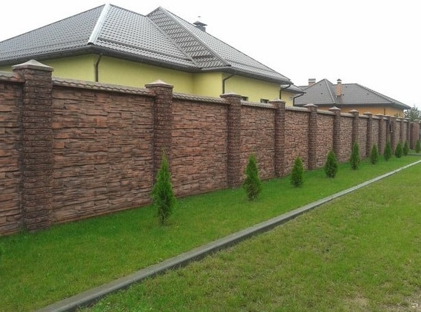 Eine Variante eines Betonzauns mit einem Finish, das Ziegelmauerwerk imitiert. Die unteren Abschnitte sind in Form von Naturstein gemacht. Dieser Entwurf sieht auf jeder Landseite sehr sympathisch aus.