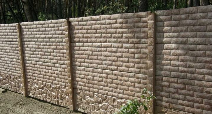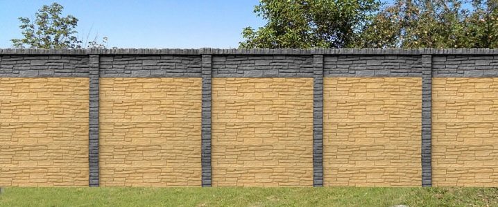 Diese Option eines Betonzauns erfordert kein Gießen des Fundaments.Die Platten dafür liegen auf einer breiten Basis, die für ausreichende vertikale Stabilität sorgt. Ein solches Zaunsystem kann jedoch nur auf einer bestimmten Bodenart installiert werden.