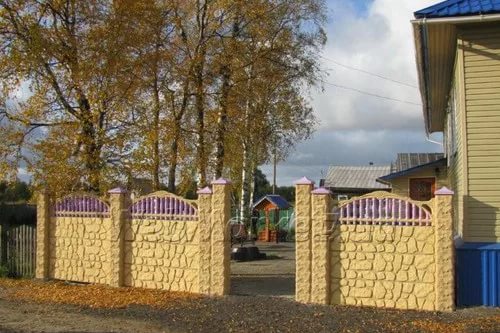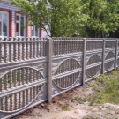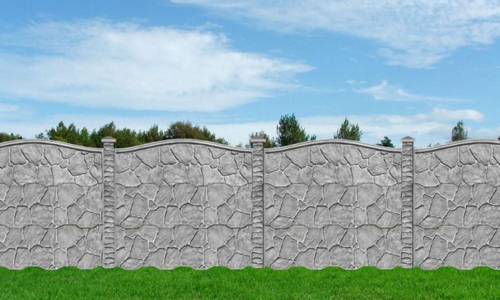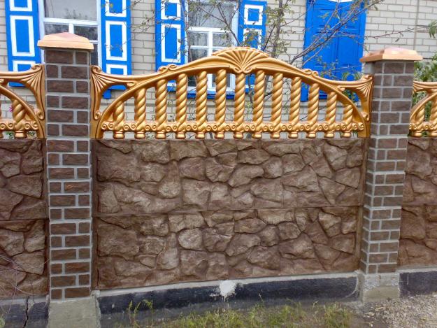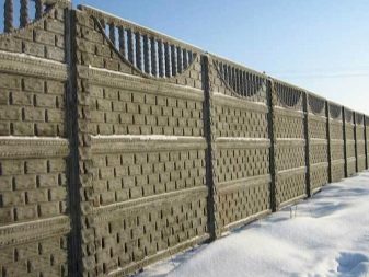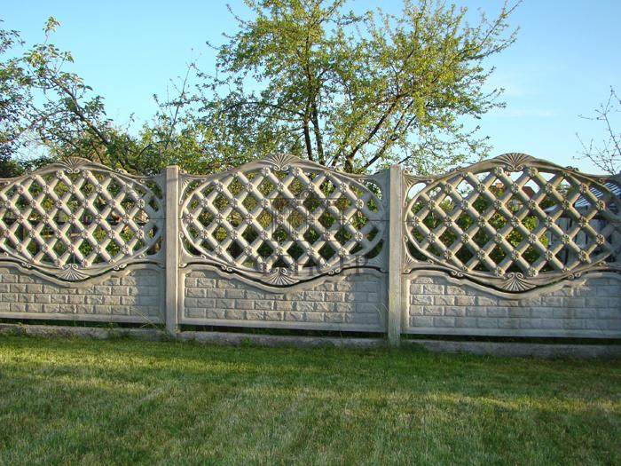 Gestapelter oder verstärkter Betonzaun - eine aus Abschnitten bestehende Struktur, in der sich mehrere Betonplatten befinden. In der fertigen Form sieht dieser Abschnitt wie eine ganze Platte aus, wo das geflochtene dekorative Design oben ist. Dieser Zaun unterscheidet sich vorteilhafterweise von ähnlichen Konstruktionen.