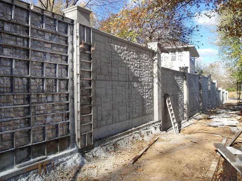 Sand, Stein und Beton werden verwendet, um einen Mörtel für die Befestigung der Basis des Zauns zu machen, Dachmaterial ist notwendig, um den Wassergraben vor dem Abwerfen und Absenken zu schützen. Die Lösung sollte auf eine zuvor vorbereitete Drainage aus Schutt gegossen werden, nach dem Aushärten sollte die Schalung installiert werden. Es behält die Form und Stärke der gesamten Struktur. Dann müssen Sie einen Rahmen aus Metallträgern und Bewehrung machen, der hinsichtlich der Schalungsparameter kleiner ist. Halter für die Pfosten werden am fertigen Rahmen befestigt, dann werden Betonplatten installiert.