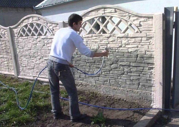 Um das vorzeigbare Aussehen zu erhalten und die Lebensdauer des Betonzauns zu verlängern, ist es 1-2 Mal pro Jahr erforderlich, die Oberfläche der Struktur mit einer speziellen Schutzimprägnierung zu behandeln.Der dekorative Betonzaun schützt nicht nur den Standort und die Gebäude, sondern auch das ästhetisch attraktive Objekt. Die Vielfalt der Arten, Farben und Texturen von Betonzäunen ermöglicht es Ihnen, das Gebiet vorteilhaft von ähnlichen Gebieten zu unterscheiden.