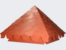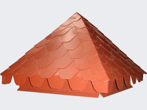 - Metallischaus Kupfer oder Zinn, verzinkter Stahl, Edelstahl. Kann mit schmiedeeisernen Elementen verziert werden. Unter Beachtung der Korrosion, also sicher sein, oben mit Polymerzusammensetzungen aus Polyester, Plastisol bedeckt. Perfekt kombiniert mit Wellpappe, oft damit verwendet.
