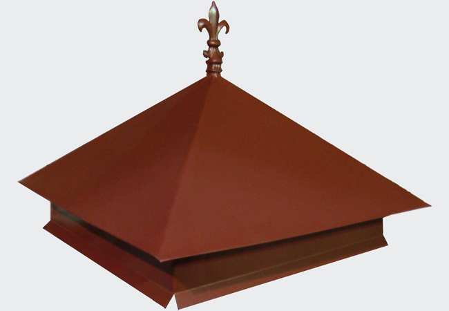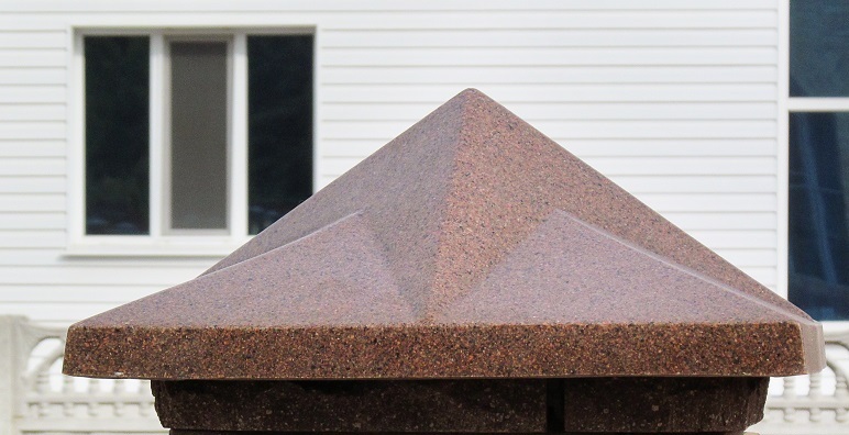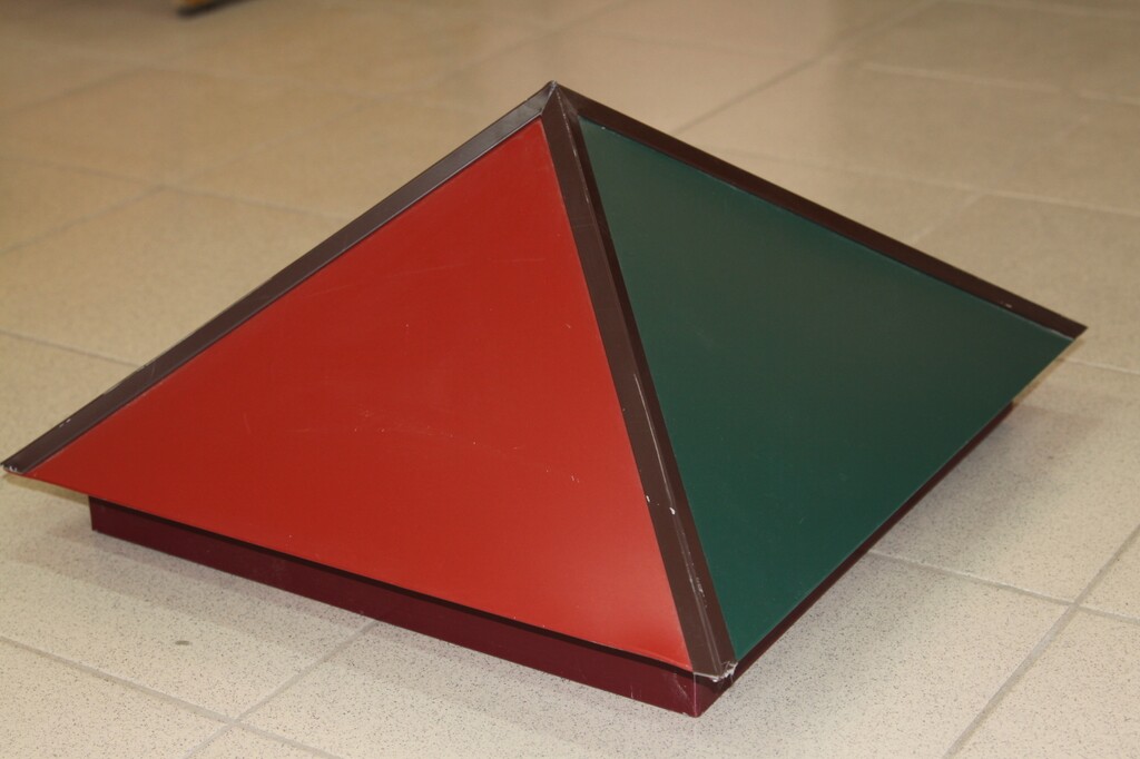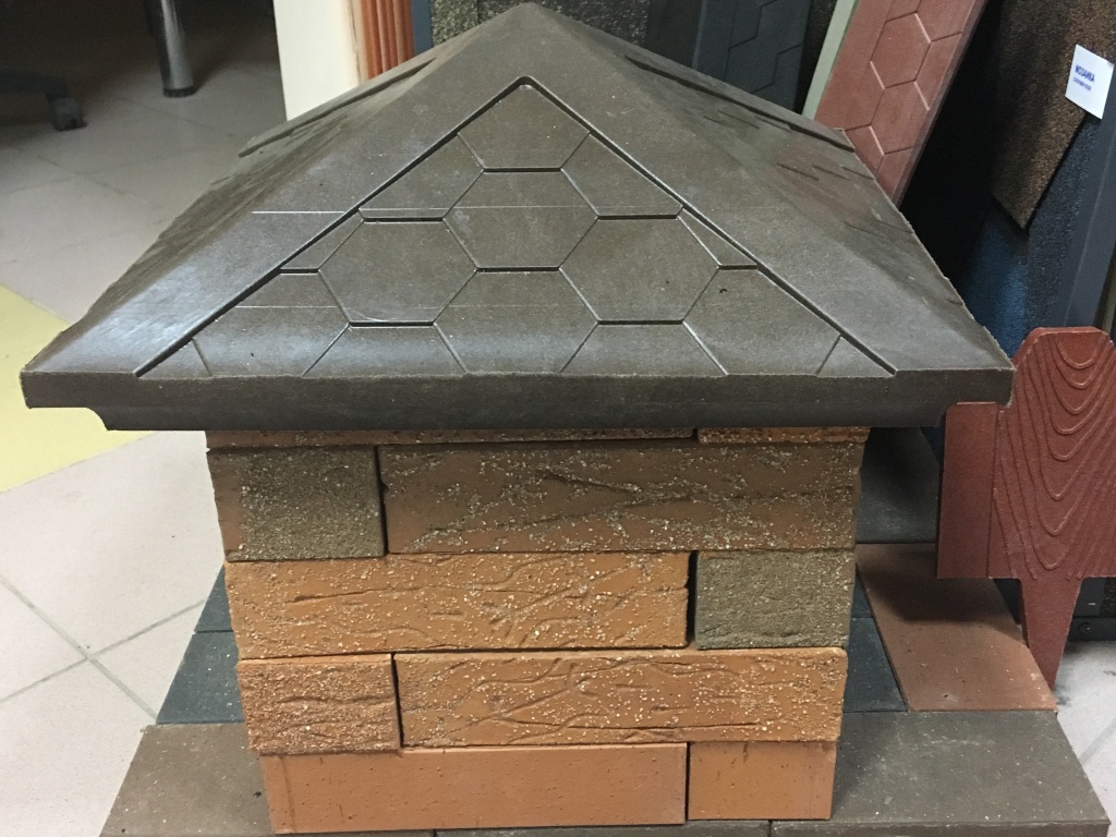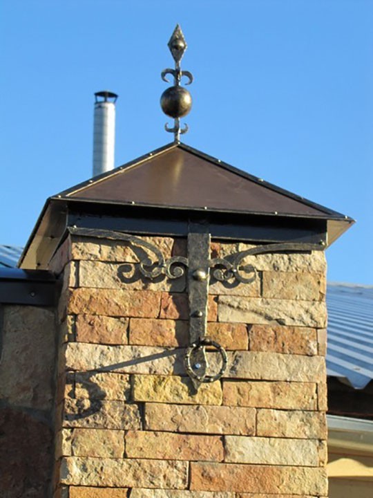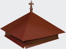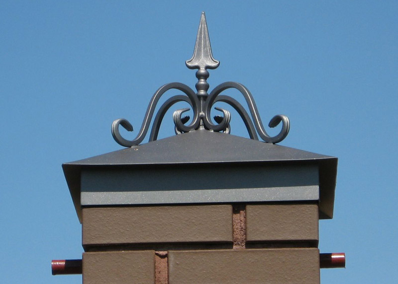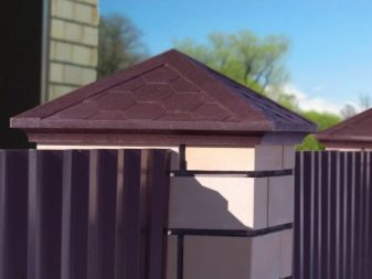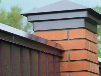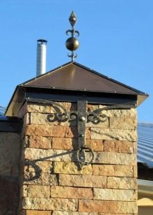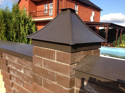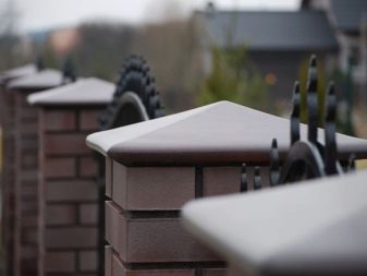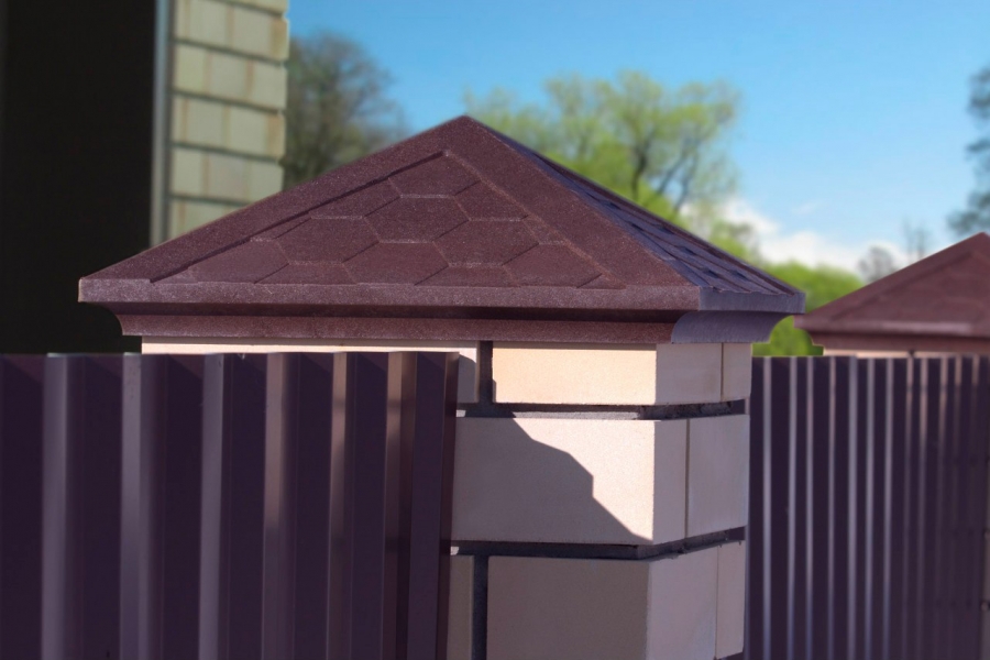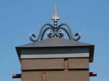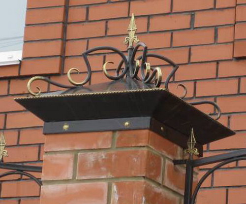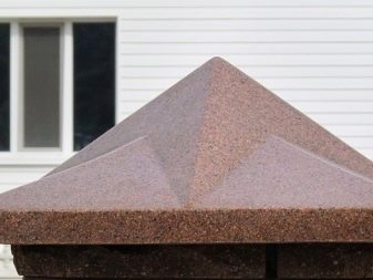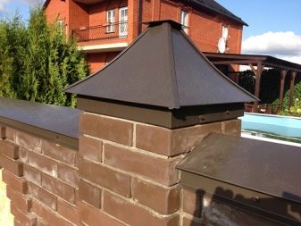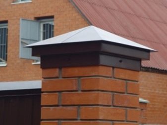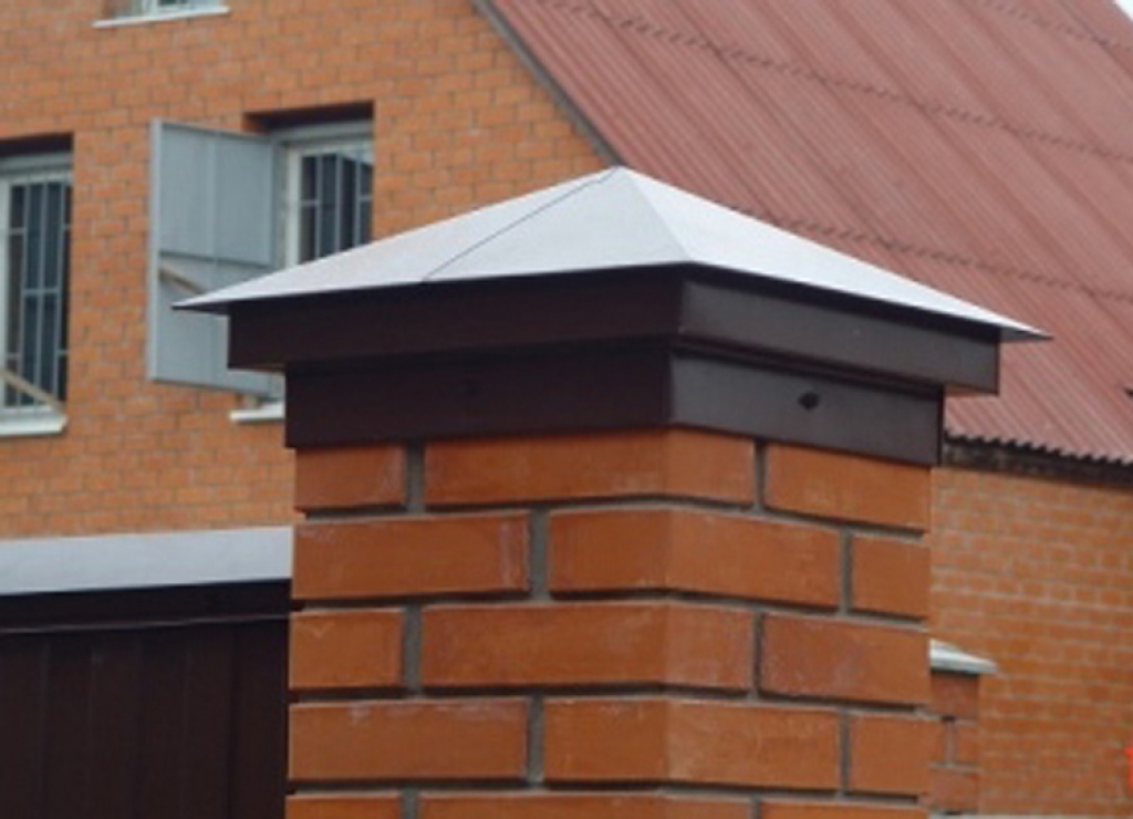 Dies sind Kappen, die oben auf den Säulen montiert sind. Sie sehen aus wie Pyramiden oder kleine Dächer, sie können rund sein und eine Vielzahl anderer Formen. Die Form des Deckels lässt Wasser oder Schnee auf jeden Fall herunterfließen, verschiedene Rillen sind möglich. Manchmal hat die Kappe eine scharfe Spitze oder dekorative Elemente, Figuren, Lampen.Es wird aus verschiedenen Materialien hergestellt, die eine Haupteigenschaft haben - Beständigkeit gegen aggressive Umwelteinflüsse, Niederschlag.