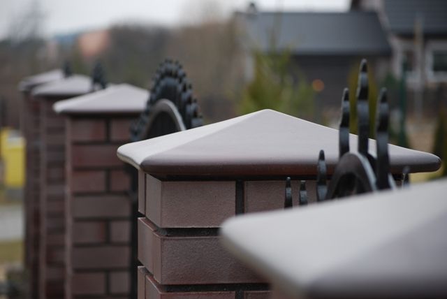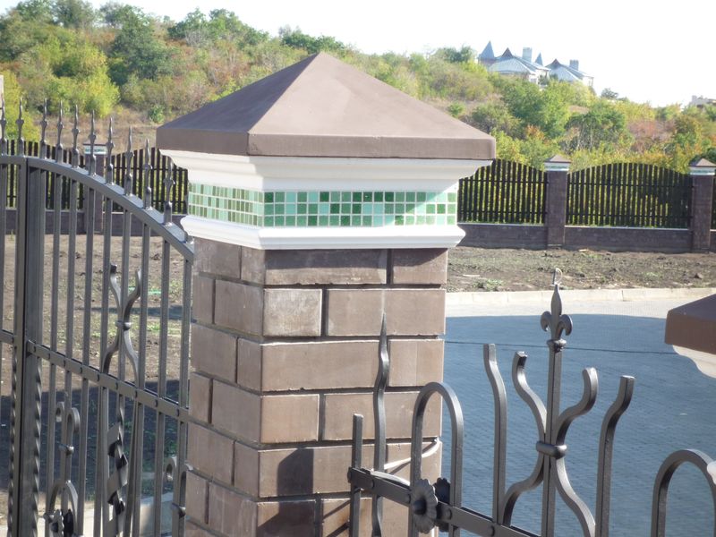 - Die dekorative Funktion ist ebenfalls wichtig. Diese gemusterten Kappen, ausgefallene Formen, Texturen und Farben schaffen ein Finish des Zauns und verleihen ihm einen einzigartigen Stil.