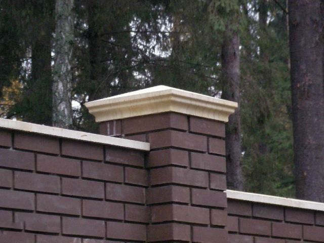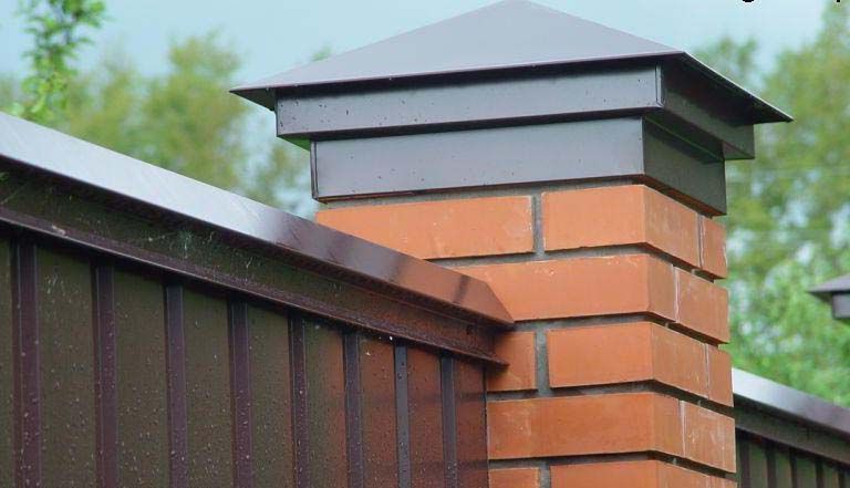 - Kappen schützen das Mauerwerk vor Wasser, Sonne und Wind sowie vor mechanischen Einflüssen und verhindern so die Zerstörung. Auch Metallrohre, Verstärkungssäulen von innen, müssen vor Korrosion geschützt werden. Stopfen in Form von Lamellen und schließen die Zaunplatte.