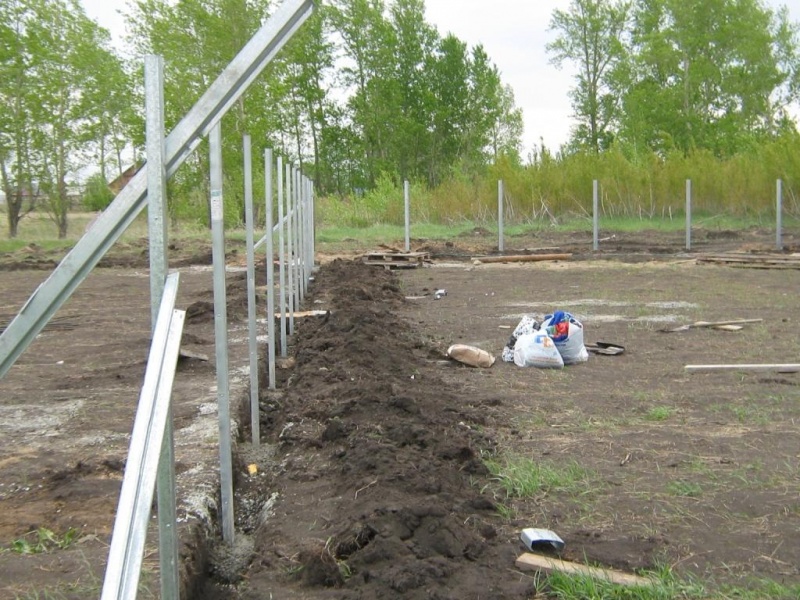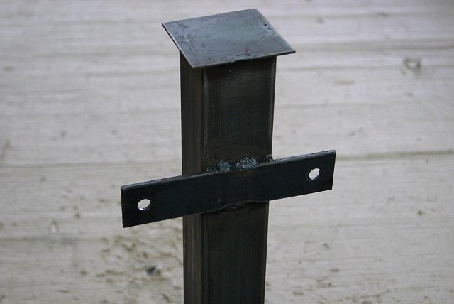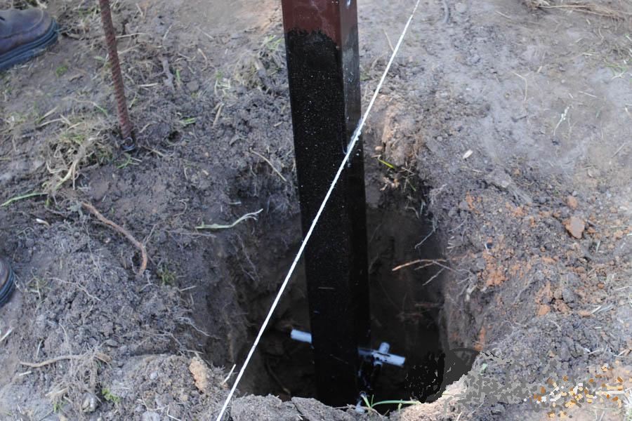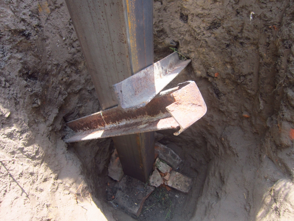 - Es gibt auch eine eher stationäre Methode zum Patchen. Die Pfosten sollten eine geschweißte Ferse haben, oder ein Durchgangsloch von 15 bis 20 cm Länge wird in den Boden geschnitten, in den der Beton gegossen wird. Es ist notwendig für eine bessere Fixierung des Pfostens.