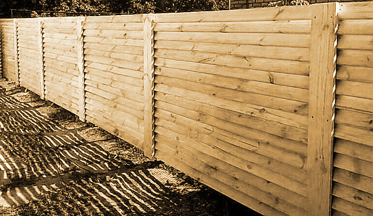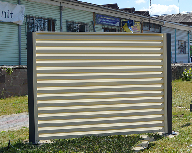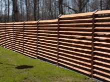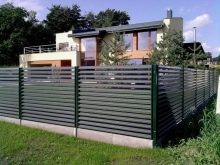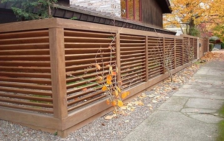 Trotz der Tatsache, dass die Form der Jalousien vielen bekannt ist, wird sie bei der Herstellung von Zäunen relativ spät verwendet. Die tragenden Säulen, die integrale Elemente der Zäune sind, sind sicher auf dem Boden befestigt und horizontale und vertikale Lamellen sind zwischen ihnen platziert. Sie sind geneigt und erzeugen den gewünschten Effekt.Von der Seite scheint es, dass um das angrenzende Grundstück herum ein durchgehender Zaun installiert wurde.