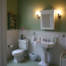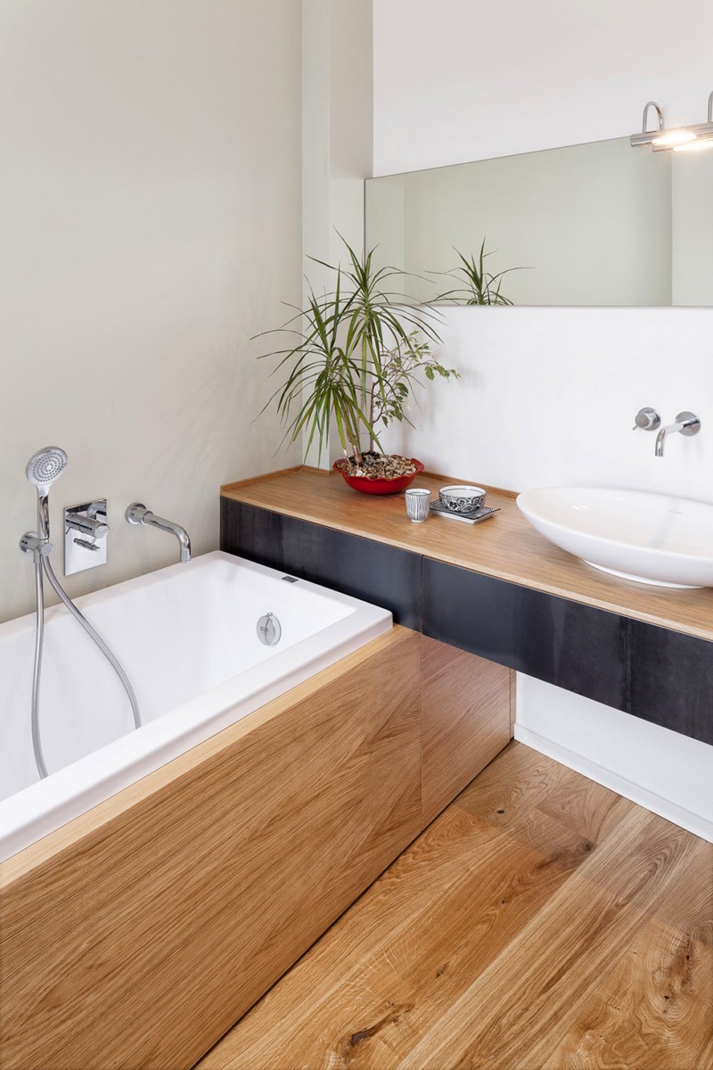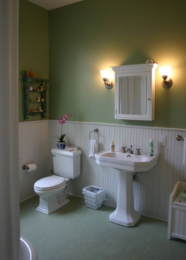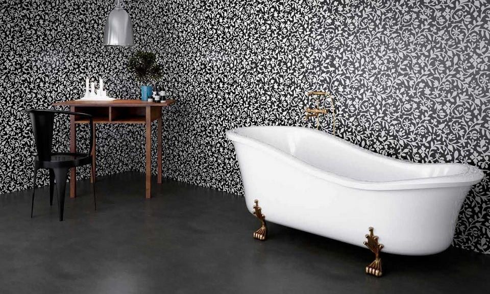 Linoleum hat eine ausgezeichnete Beständigkeit gegen Feuchtigkeit. Darüber hinaus behält das Wandmaterial auch im Badezimmer seine Farbe.